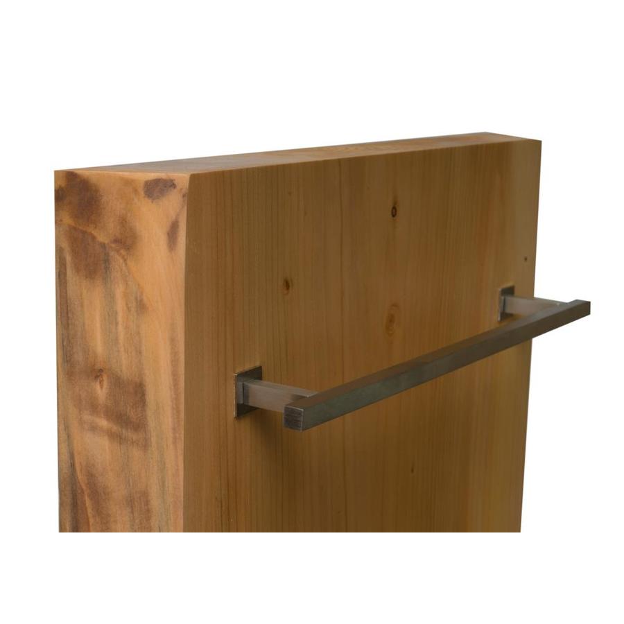 Available with vertical or horizontal wall-mounting options; ABTW1632V or ABTW3216H Exclusive cedar wood and brass construction coated with a Polished Chrome finish Wood slab has visible natural grains and knots Simple step by step installation Towel warmer can be hardwired, or a separate plug can be purchased (plug not included) and attached and plugged into an available outlet. Electrical requirements 110 Volts, 60 Hertz, 2 Amps, 200 Watt Works well in modern or traditional spaces Starting from room temperature around 68°F this towel warmer reaches 80% of its maximum heat within 20 minutes, 113°F To reach 100% of the maximum temperature (130°F) it takes another 25 minutes