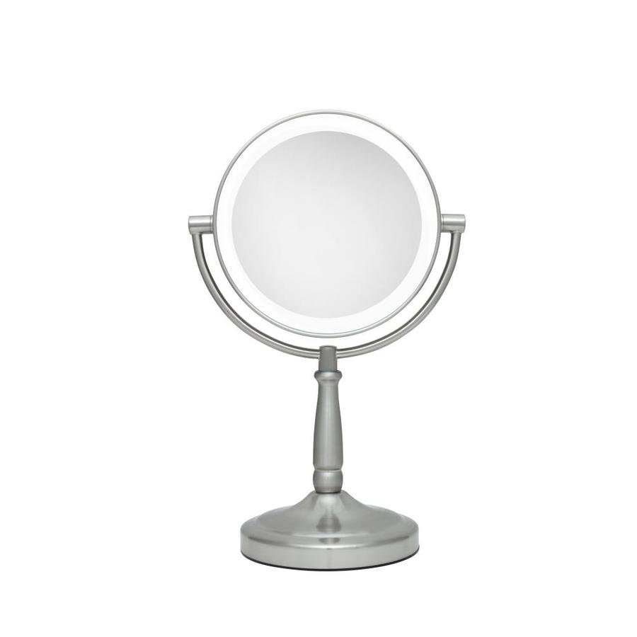 Completely cordless so you can get ready in any room without a nearby electrical outlet Vivid LED lighting evenly illuminates your entire face Use the full-view 1X side for everyday grooming, and the convenient 5X magnification side to zoom in on details Switch effortlessly between each magnification side with the 360 degree endless mirror head rotation Product Dimensions 9-in x 5.5-in x 14-in Designed in the USA 4 AA Batteries Required (Not Included) Satin Nickel Finish