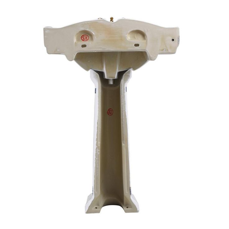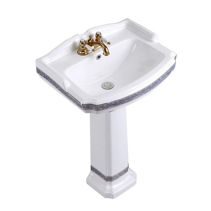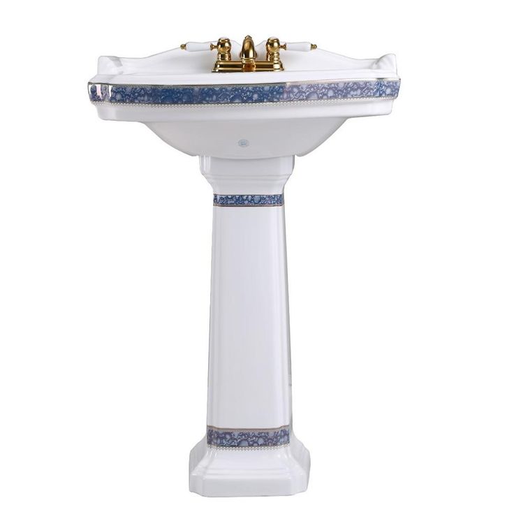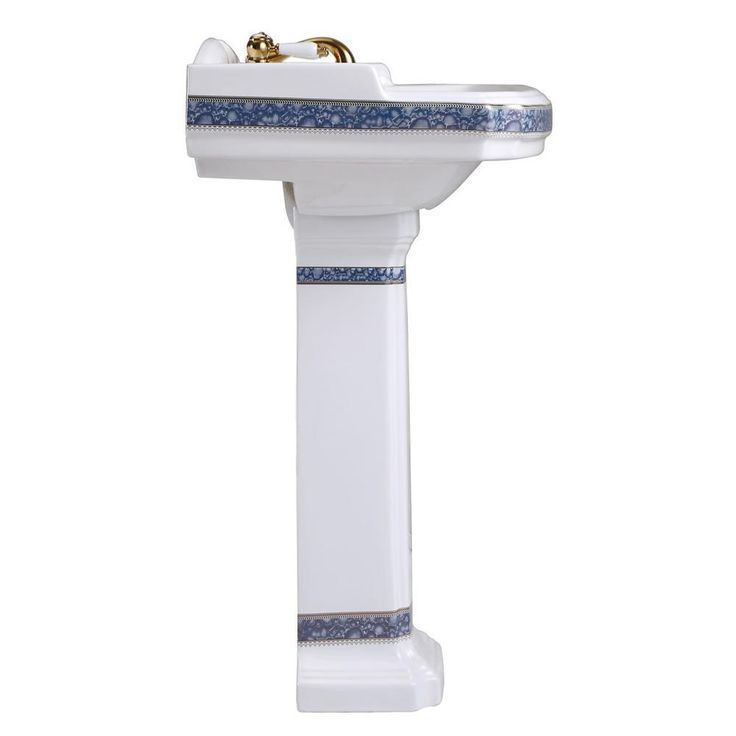 Bathroom Pedestal Sink Unique Blue and Gold Painted Design White Porcelain 4 in. Center set Faucet Holes. Faucet is not included. Interested in a matching toilet. Please see item 32816. Unprecedented Elegant Design in ECommerce. Renovator's Supply Ornate India Reserve Pedestal Sink Material: Porcelain Glossy Porcelain Blue and Gold Accent Dimensions 22-7/8 in. Wide, 34-1/4 in. Height, 18-1/2 in. proj. Centerset Faucet Hole Boring with Overflow in Single Basin Matching Toilet Available in Catalog Search ''32816''.