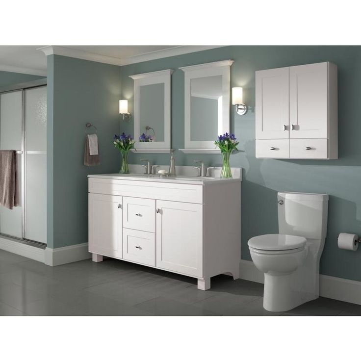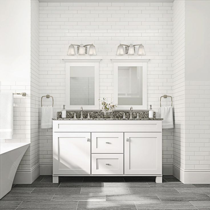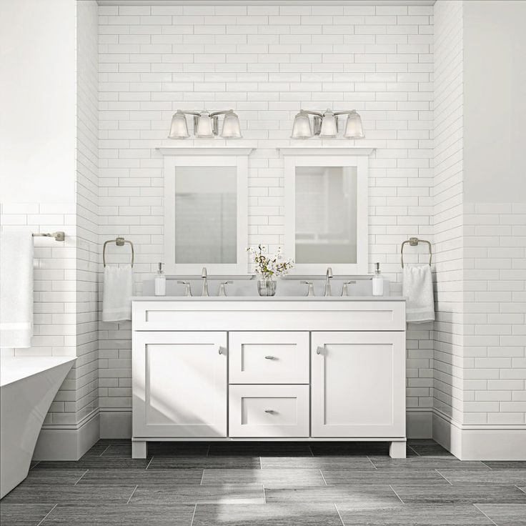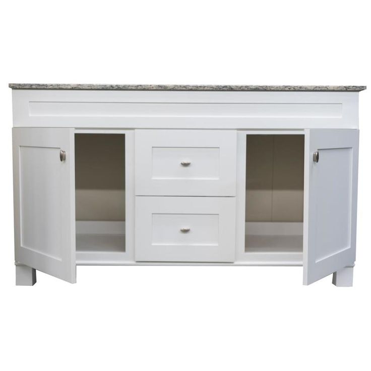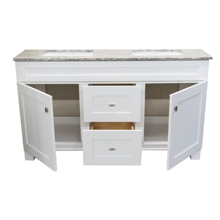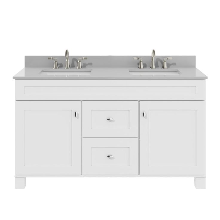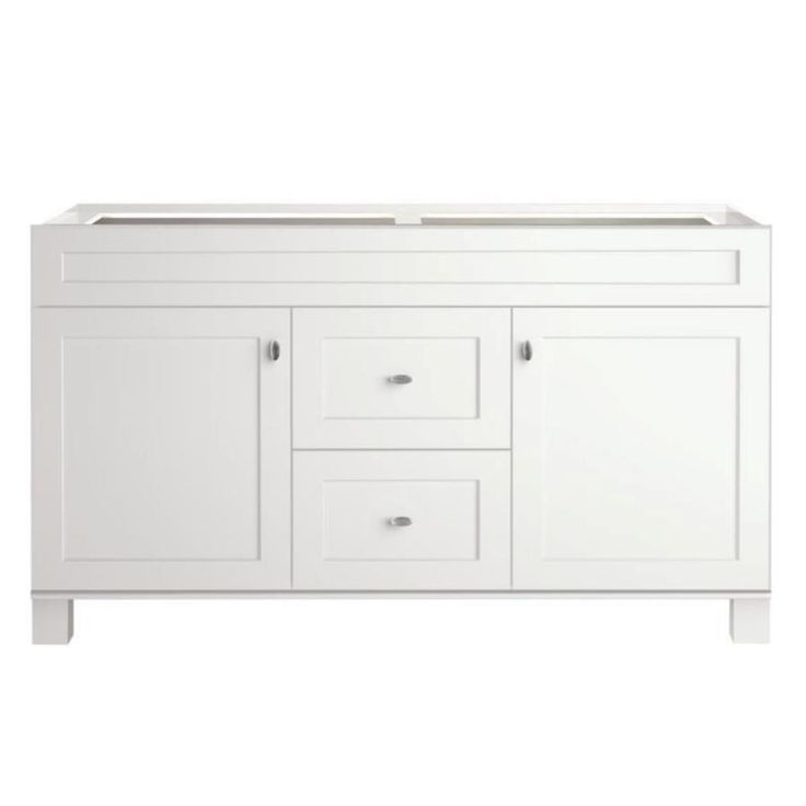 White bathroom vanity from the Palencia collection offers a fresh, minimal design to complement a variety of bathroom decor Features 2 full-extension solid wood dovetail drawers and 2 SmartStop soft-closing doors Great for contemporary style decor Compatible with 61-in W x 22-in D vanity tops (sold separately) 60-In W x 21-in D bathroom vanity Brushed-nickel finish hardware adds a touch of shine Fully assembled and ready to be installed Select sizes available for pickup today in stores All collections and sizes available for delivery to store within 7 days or less