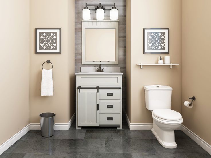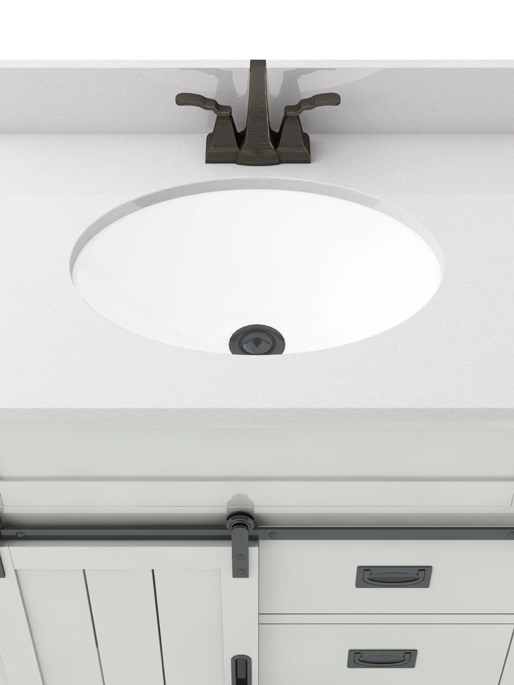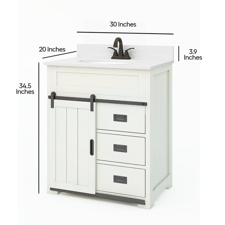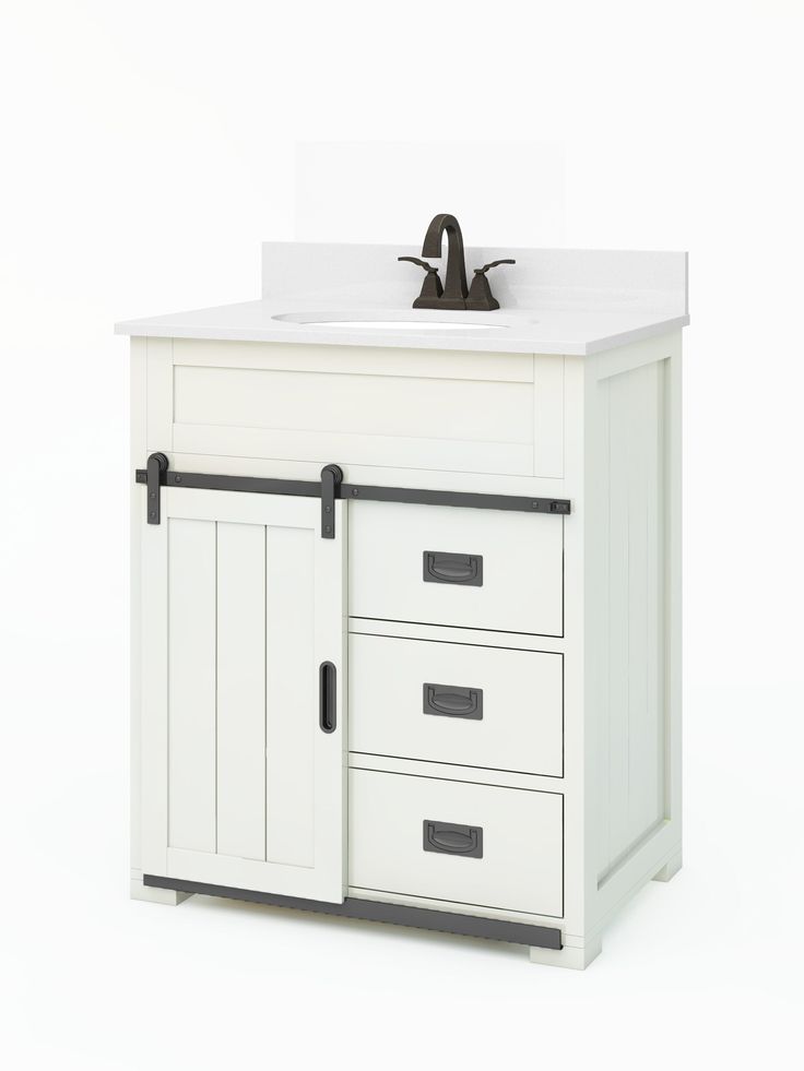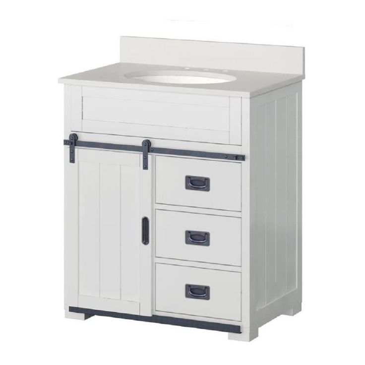 White 30-in x 20-in cultured stone top is pre-drilled for 4 In. center set faucet for easy installation (faucet not included) 4-Inch backsplash included Barn door sliding cabinet door Black iron finish hardware Matte white vanity cabinet coordinates with any bath decor Fully assembled, ready to install
