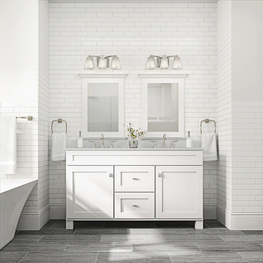 New Meridian Gray Engineered Marble provides a stunning and fashionable bathroom Attached two stylish rectangular white vitreous china undermount bowls with safety overflow holes The square flat edge profile has a unique and transitional appearance Top pre-drilled for 8-inch widespread faucet for easy installation (faucet not included) 4-in high backsplash included to help protect walls from water damage Fits 60in W x 21in D vanity Side splash available, sold separately(Item#932512)