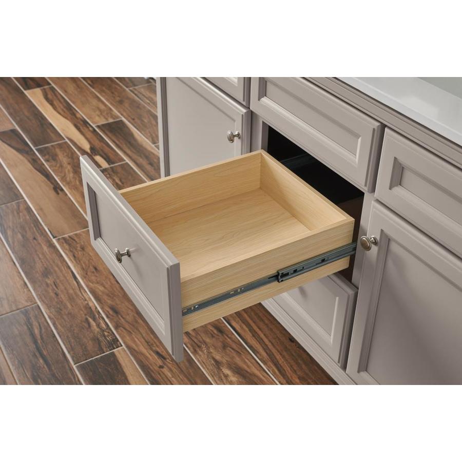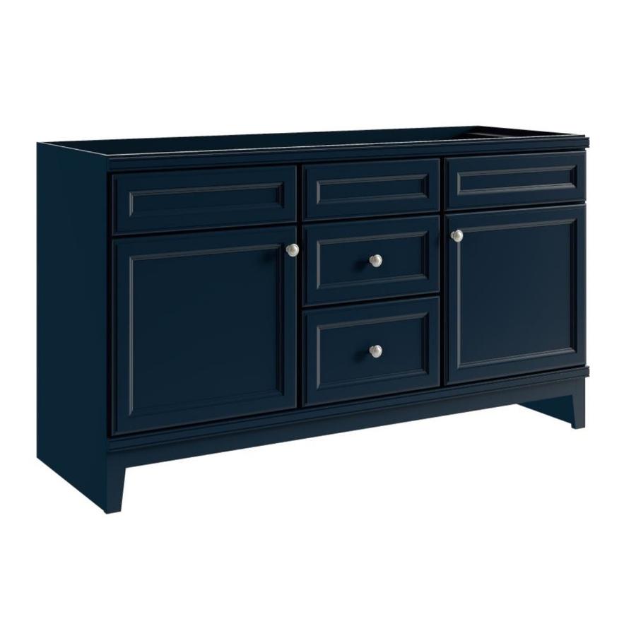 Gray finish vanity from the Calhoun collection effortlessly blends with every style Features 2 full-extension drawers and 2 cabinet doors Great for transitional style decor Compatible with 61-in W x 22-in D vanity tops (sold separately) 60-In W x 21-in D bathroom vanity Brushed nickel finish hardware adds a touch of shine Fully assembled and ready to be installed Select sizes available for pickup today in stores All collections and sizes available for delivery to store within 7 days or less
