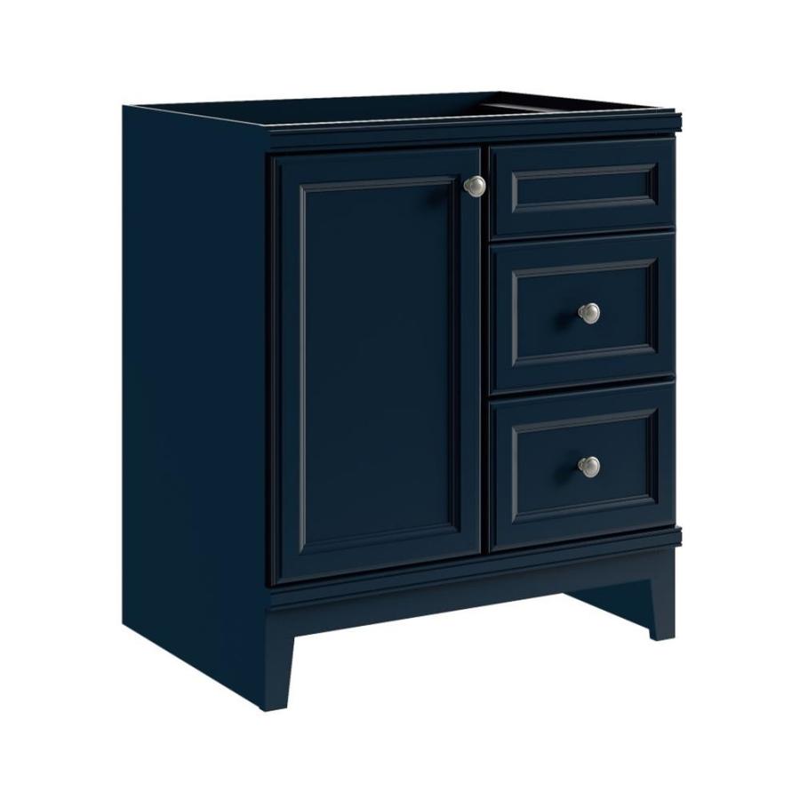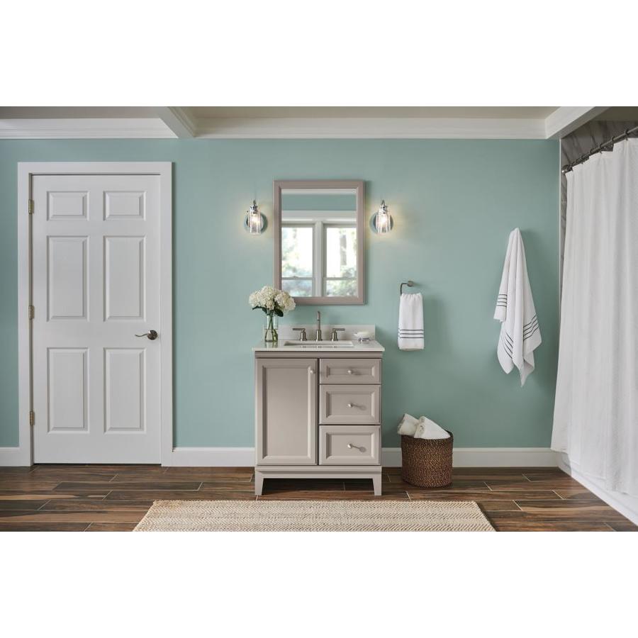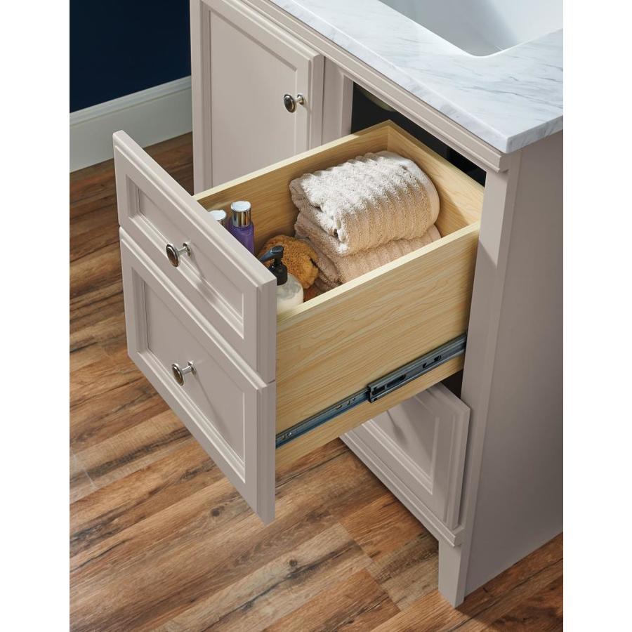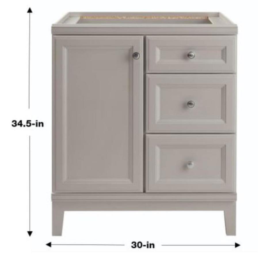 Gray finish vanity from the Calhoun collection effortlessly blends with every style Features 2 full extension drawers and a cabinet door Great for transitional style decor Compatible with 31-in W x 22-in D vanity tops - sold separately 30-In W x 21-in D bathroom vanity Brushed nickel finish hardware adds a touch of shine Fully assembled and ready to be installed Select sizes available for pickup today in stores All collections and sizes available for delivery to store within 7 days or less