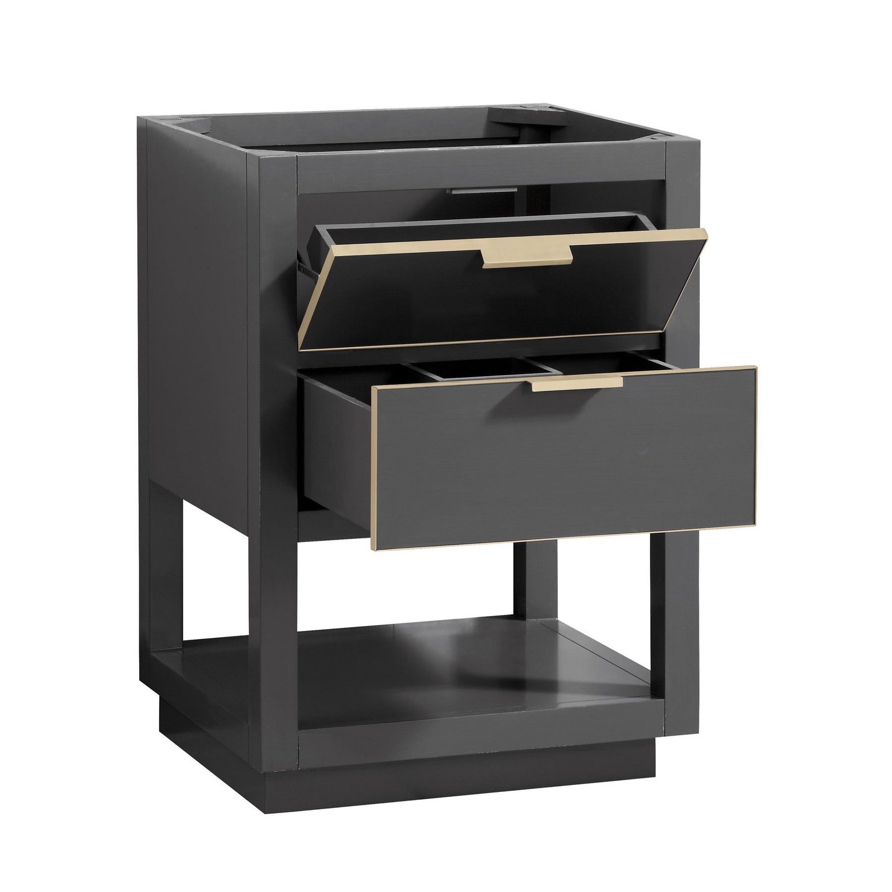 A sleek 24-inch bathroom vanity cabinet in Twilight Gray with elegant gold trim, offering generous storage and a modern open-shelf base. Built with a solid wood frame and moisture-resistant MDF panels, it features soft-close hardware and plumbing access for easy installation.