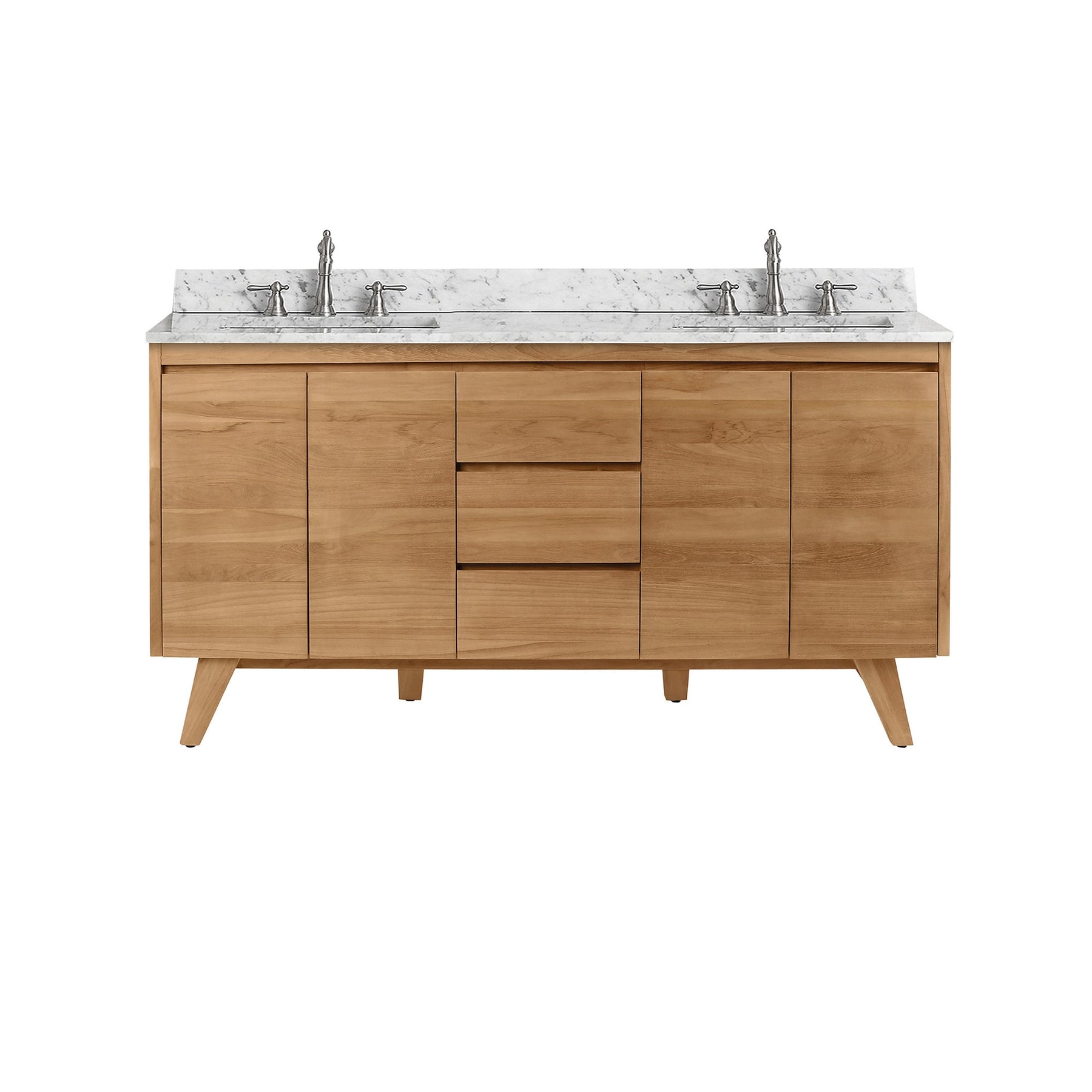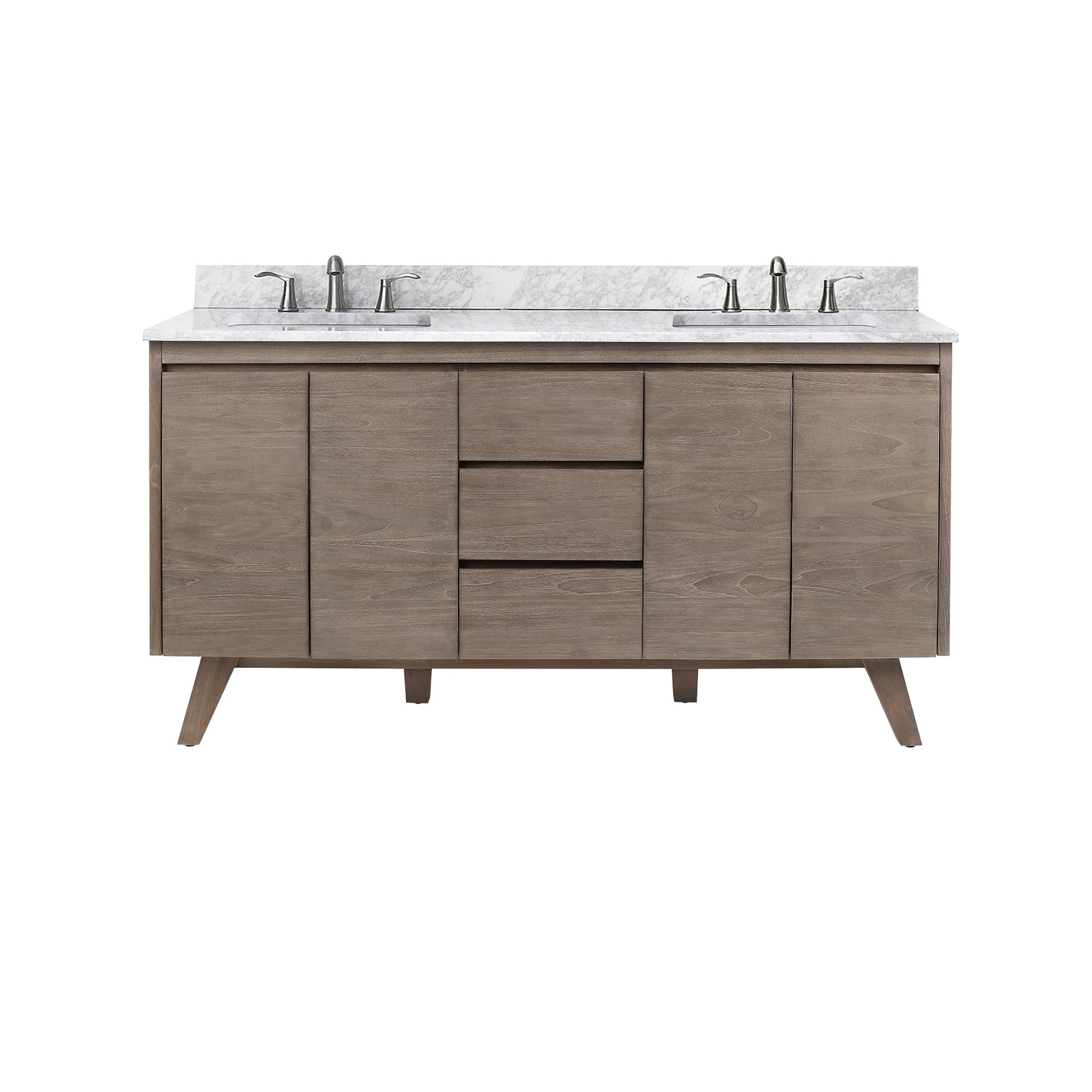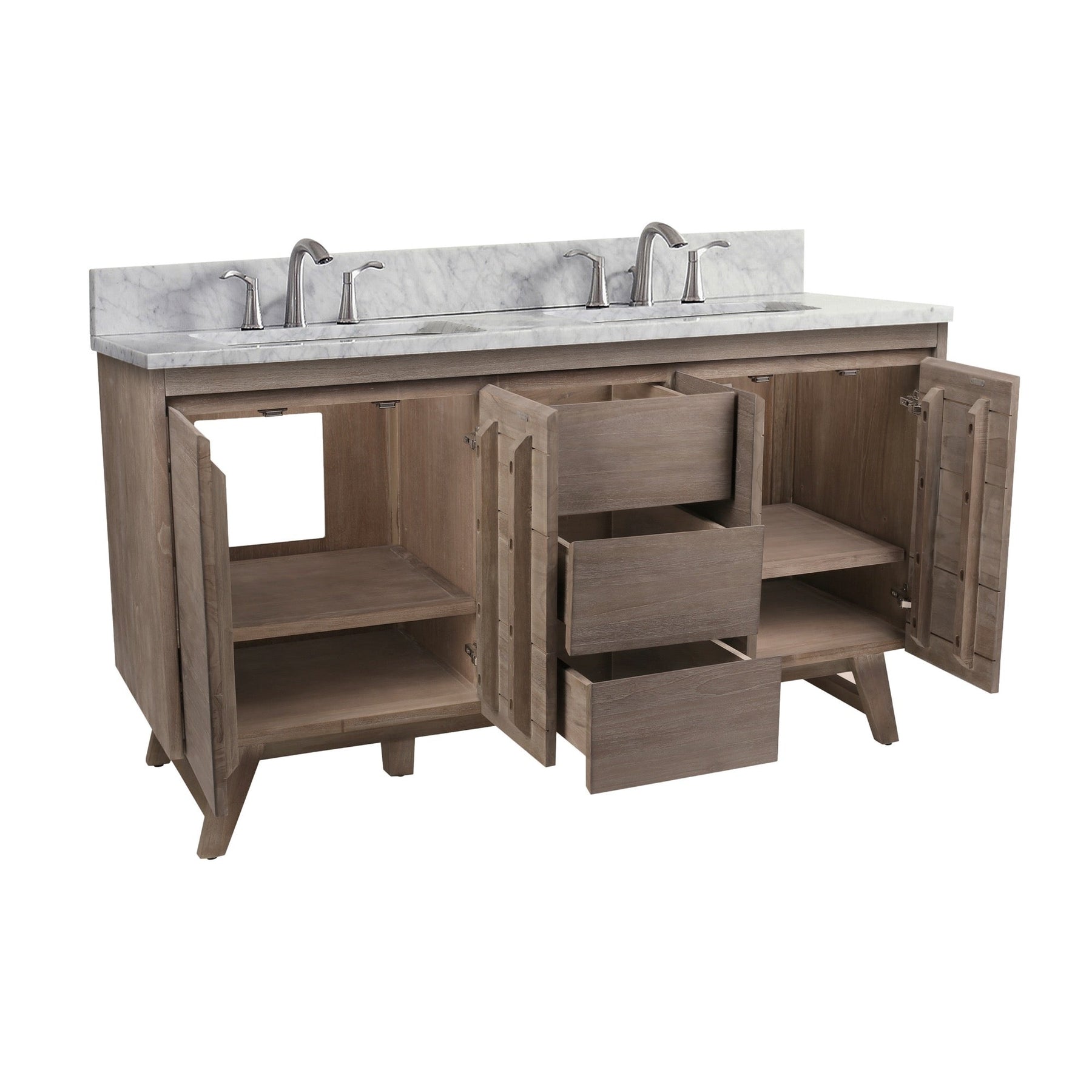 Mid-century inspired double-sink vanity crafted from solid teak and teak veneer with a water-resistant gray teak finish. Pre-drilled for 8-inch widespread faucets and designed with soft-close storage for everyday convenience. Available with Carrara marble or Cala White engineered stone tops, or as a cabinet only.