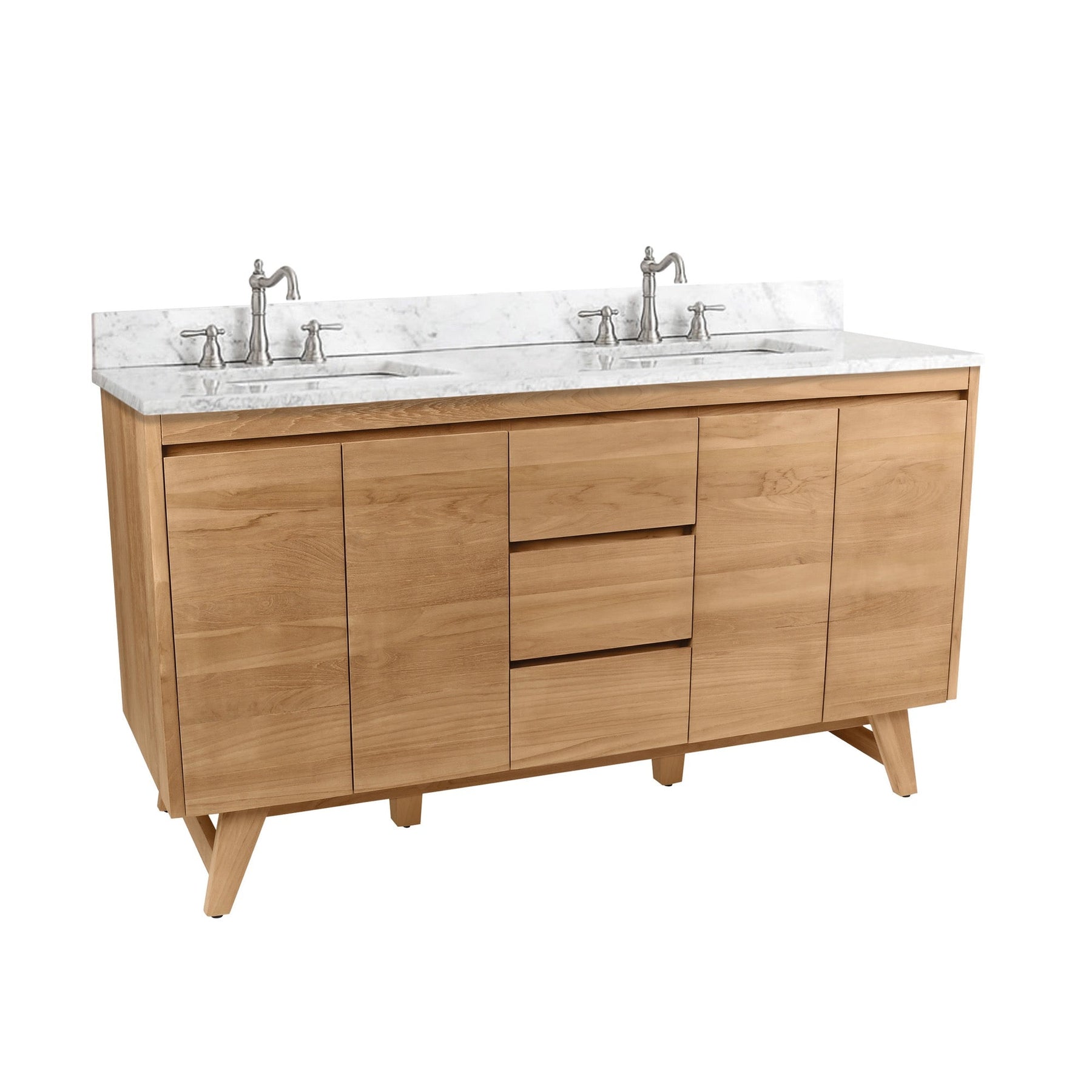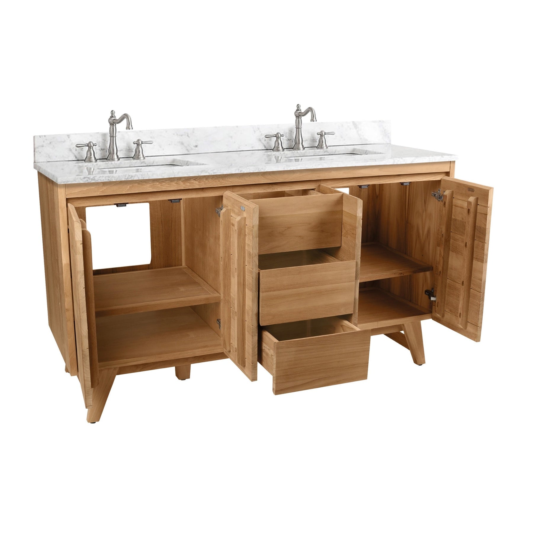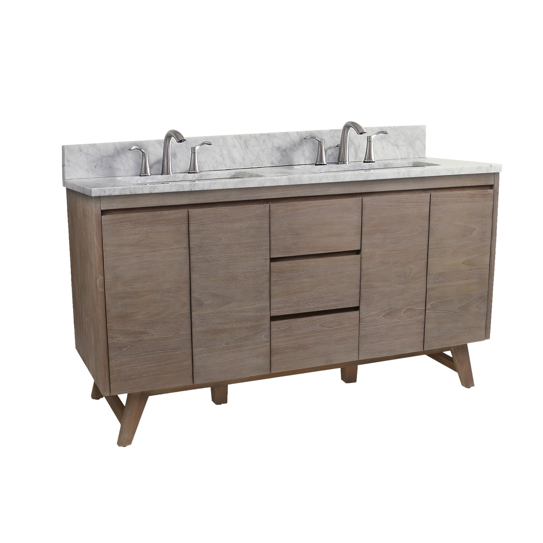 Mid-century inspired double-sink vanity crafted from solid teak and teak veneer with a water-resistant gray teak finish. Pre-drilled for 8-inch widespread faucets and designed with soft-close storage for everyday convenience. Available with Carrara marble or Cala White engineered stone tops, or as a cabinet only.