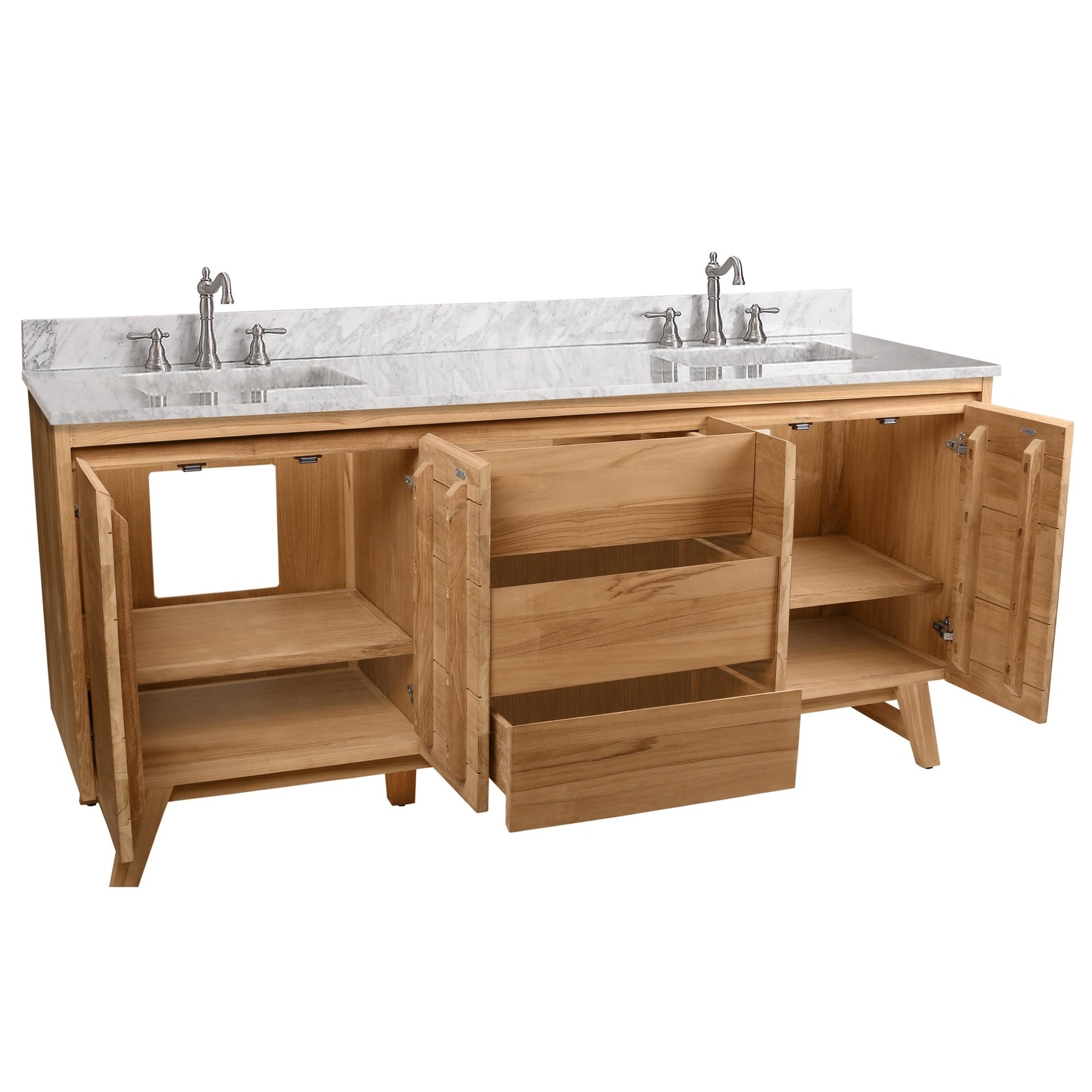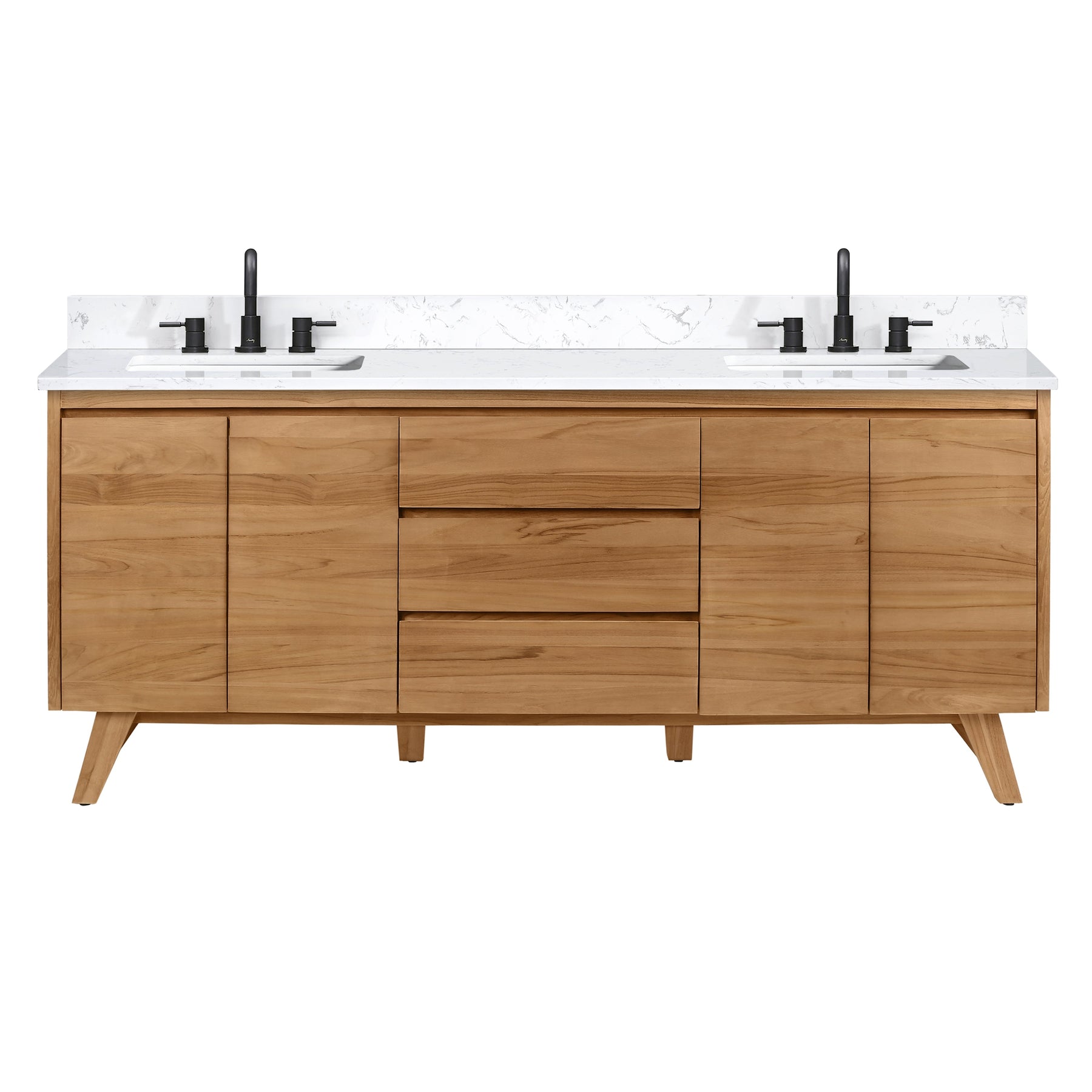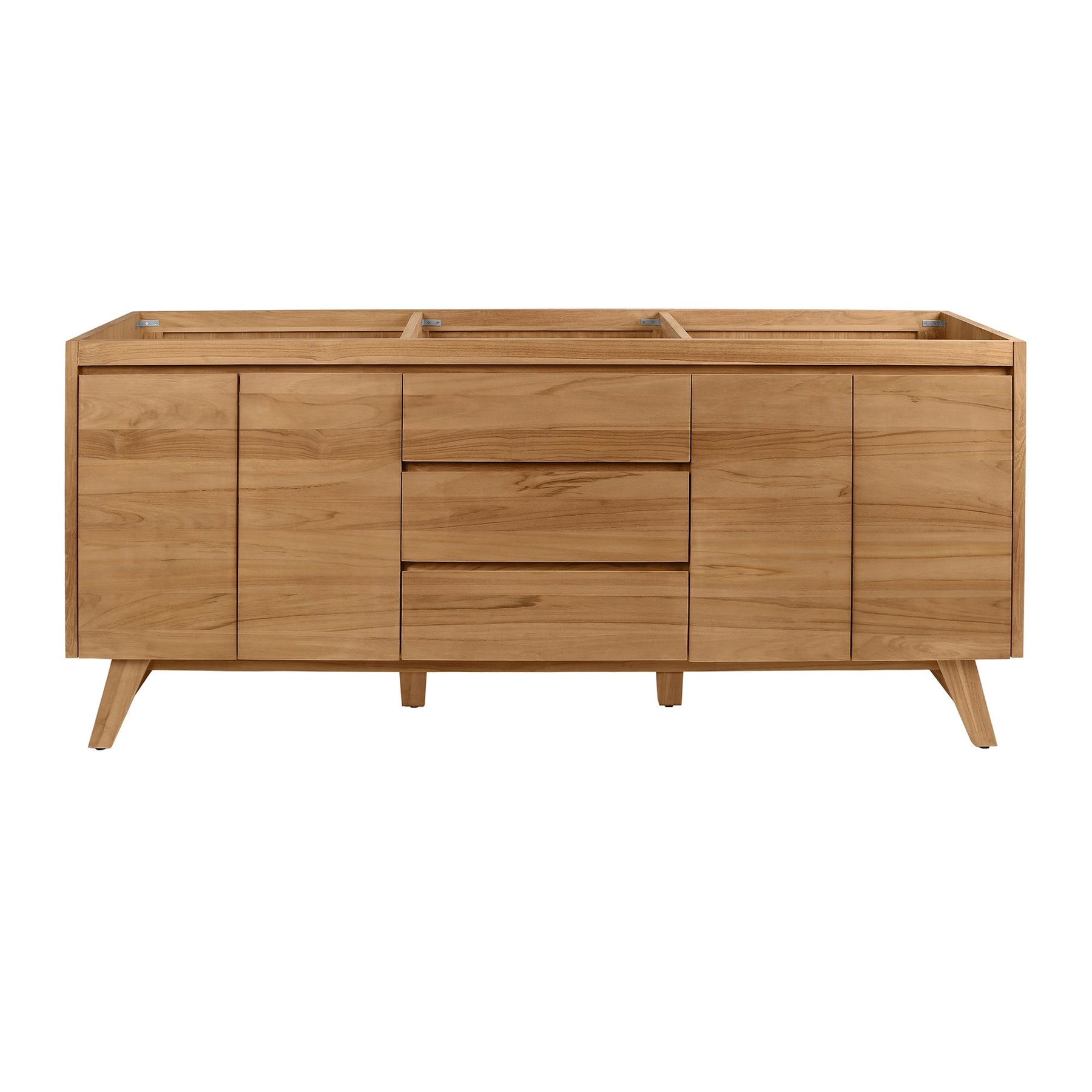 Mid-century modern inspired double-sink vanity crafted from solid teak and teak veneer in a gray teak finish. Features soft-close doors and drawers, adjustable shelves, and splayed legs with levelers for a sturdy, water-resistant cabinet ready for your choice of countertop.