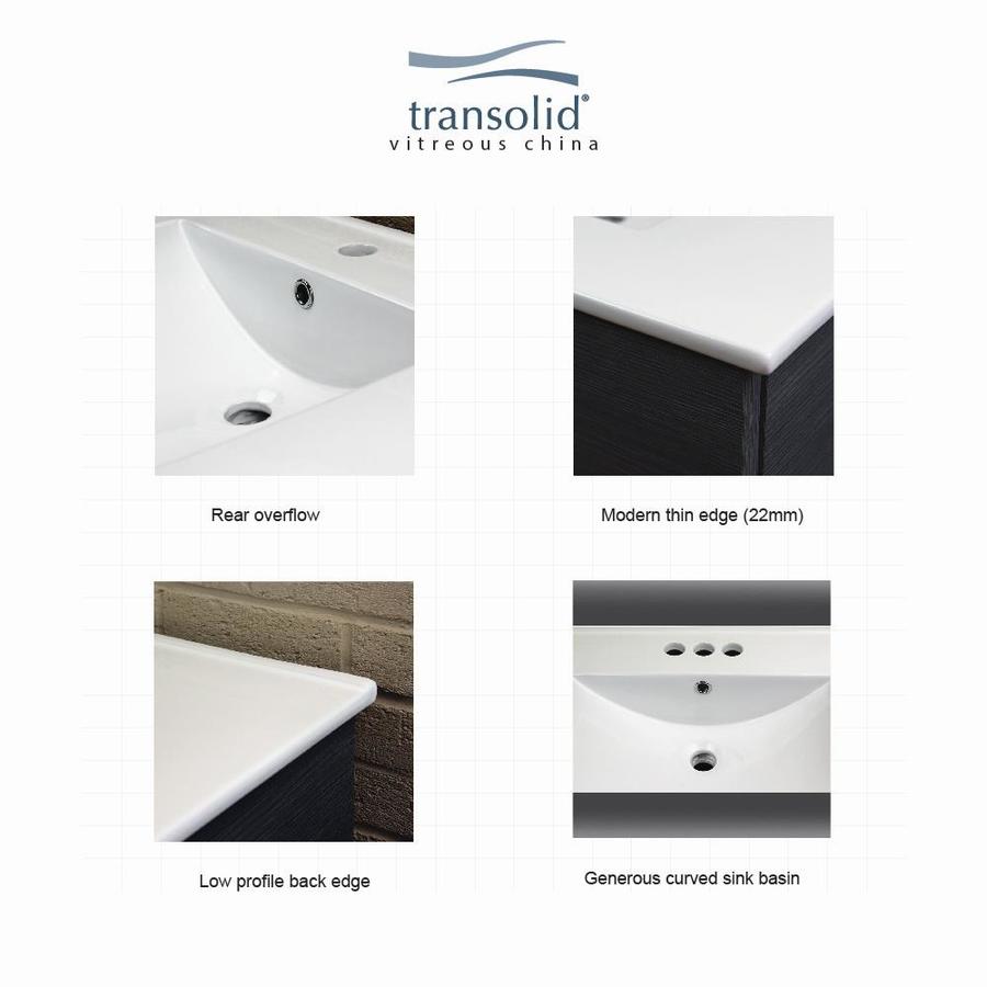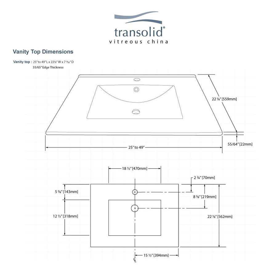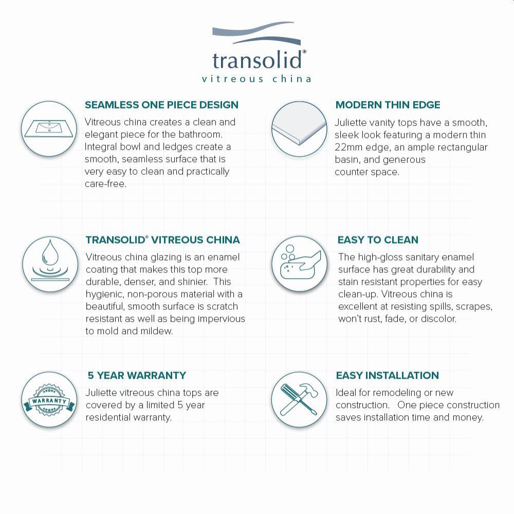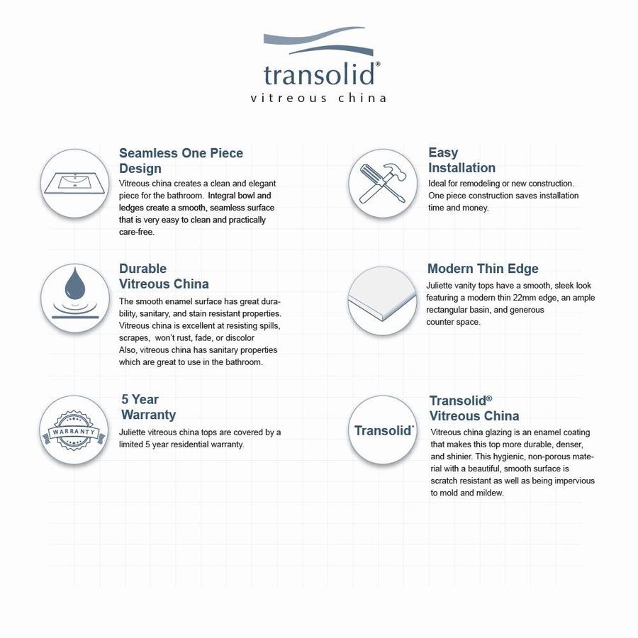 The Transolid Juliette vanity top pairs a sleek 22mm thin edge with a seamless vitreous china integral sink for a modern, easy-to-clean upgrade. Sized for 24-in cabinets, it features a single-hole faucet drilling, rear overflow, and a glossy white finish that resists stains and scratches.