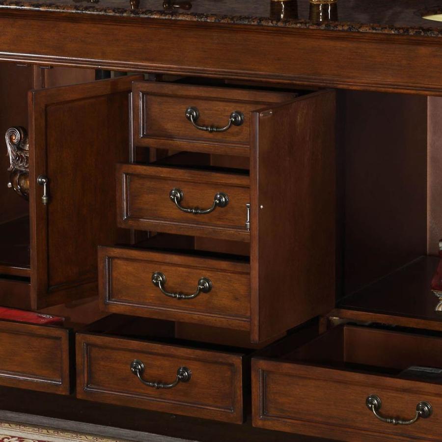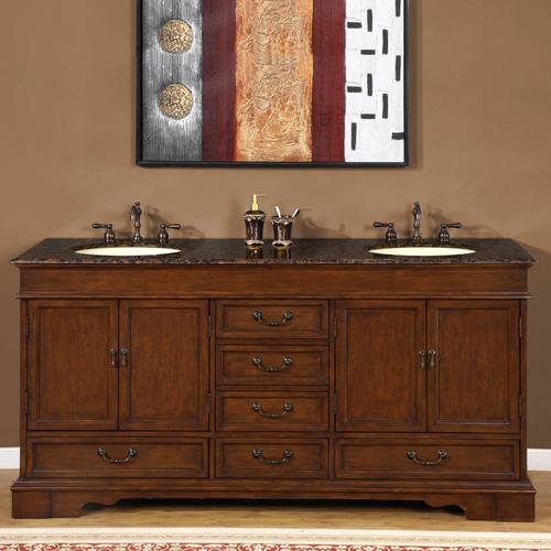 Overall dimensions (inch): 72w x 22d x 36h Traditional bathroom double sink vanity cabinet Comes with Baltic Brown granite countertop Comes with ivory ceramic undermount sink Natural stone, solid wood structure and TSCA title VI certified panels Pre-drilled for 8-in widespread faucet Drain and faucet are not included Cabinet comes with distressed finish