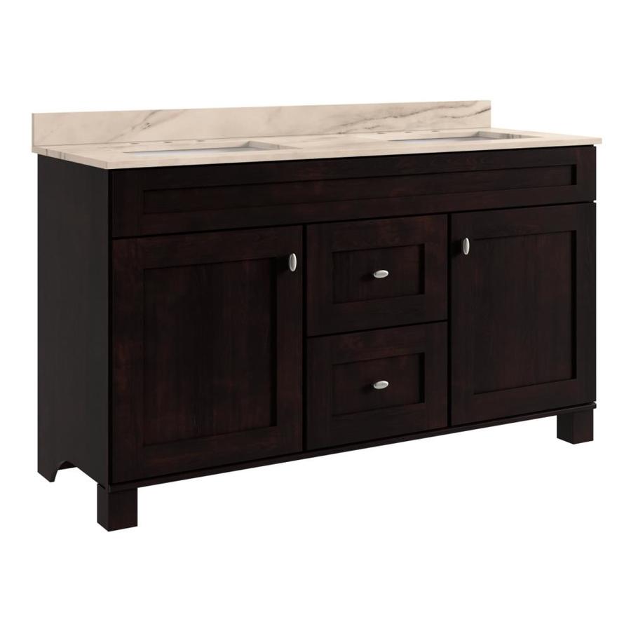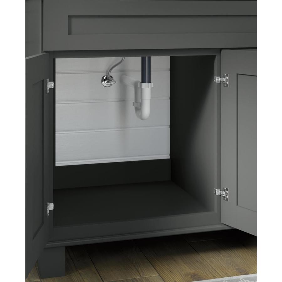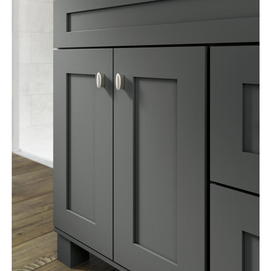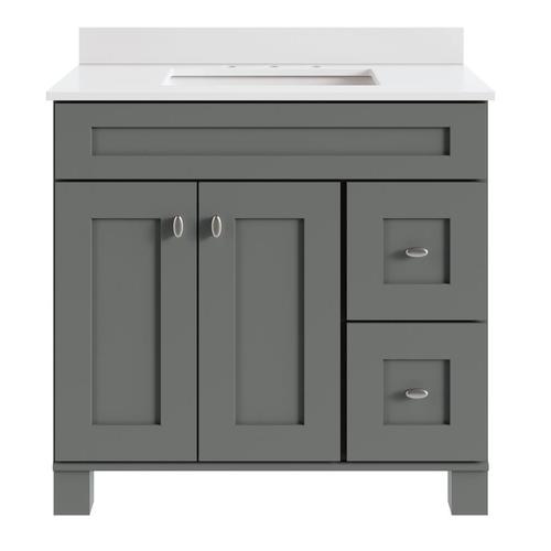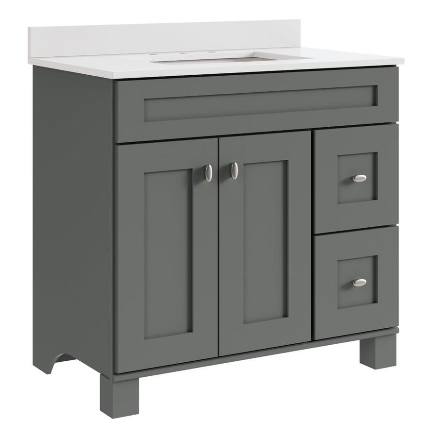 Wide-rail Shaker vanity in a Moonstone paint finish with appealing square lines and square furniture feet 37-In W x 22-in D x 38.75-in H vanity, perfectly sized for any bathroom Features 2 full-extension solid wood dovetail drawers and 2 SmartStop soft-closing doors Brushed-nickel finish hardware adds a touch of shine Premium engineered marble white vanity top blends well with most bath decor Pre-drilled 8-in widespread faucet holes for easy faucet installation 3.5-In high backsplash included to help protect walls from water damage Features a centered single rectangular white undermount bowl Coated surface that makes the vanity top resistant to stains, bacteria, mold and mildew