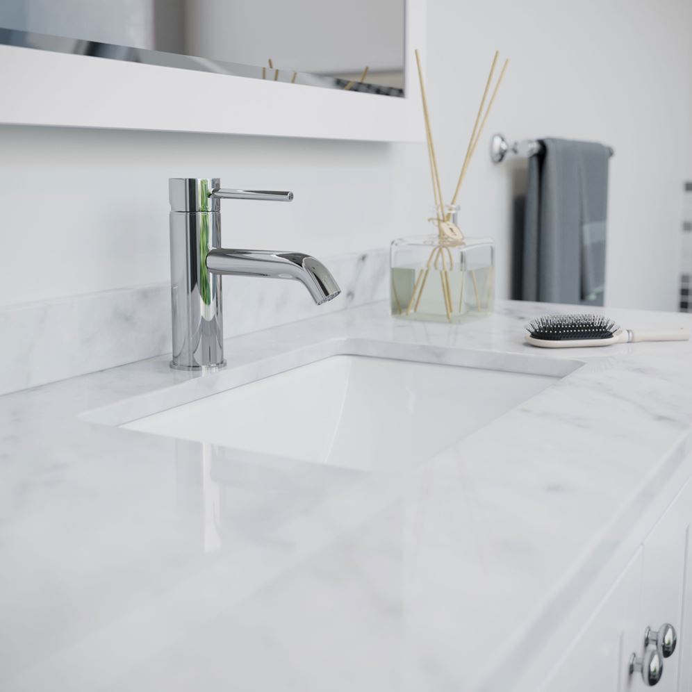 • Premium Countertop: Natural White Carrara marble top with 3-inch backsplash; undermount porcelain sink