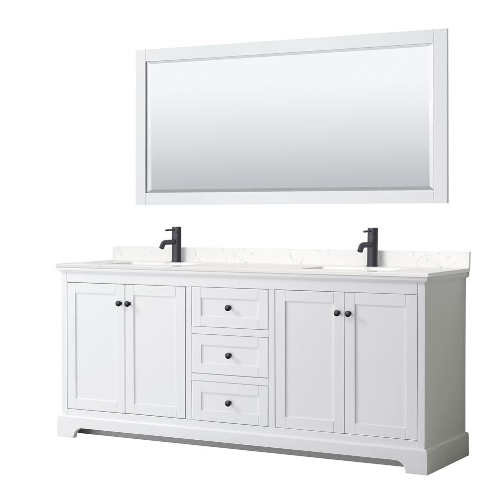 A refined 80-inch double-sink vanity from Wyndham Collection, the Avery blends transitional styling with durable construction. Finished in white with a natural White Carrara marble countertop and included 70-inch matching mirror, it delivers generous storage, soft-close hardware, and a water-resistant, low-VOC sealed finish.