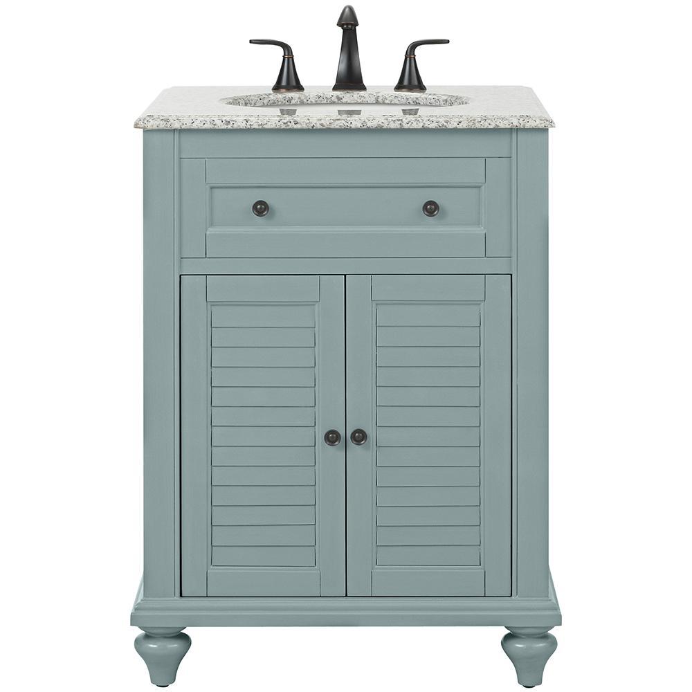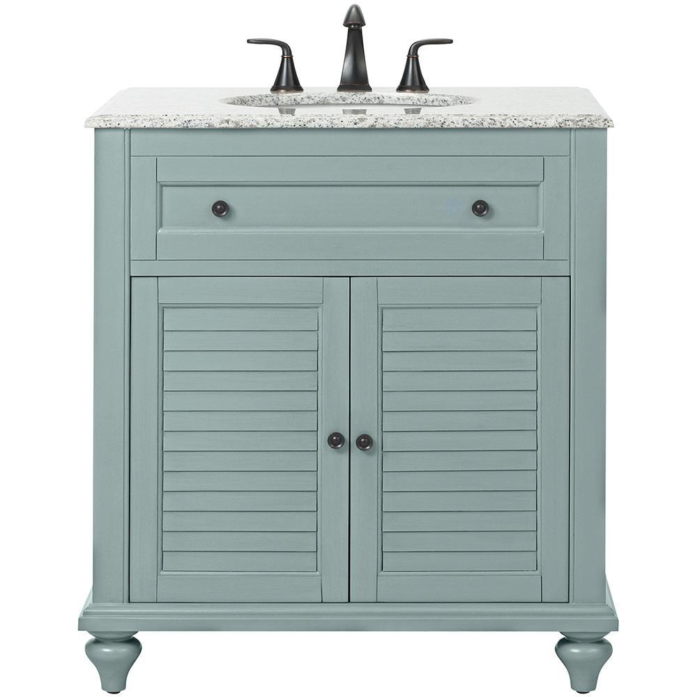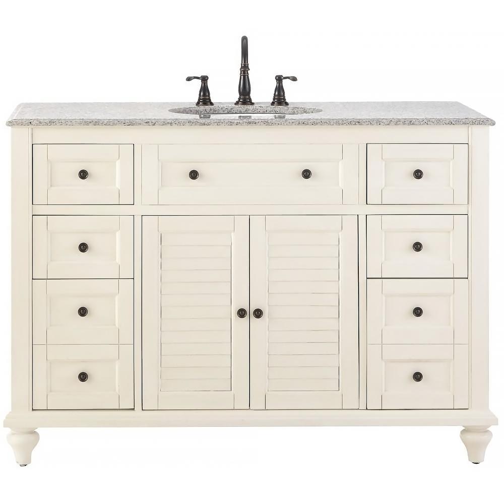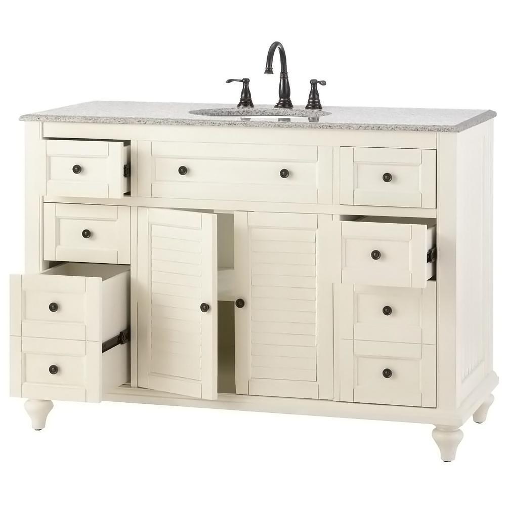 Drawers line the front sides and top giving you ample storage space. Shutter doors and sides give our bath vanity character along with a white finish. And the grey granite top coordinates perfectly to finish off our beautiful bath vanity's look.