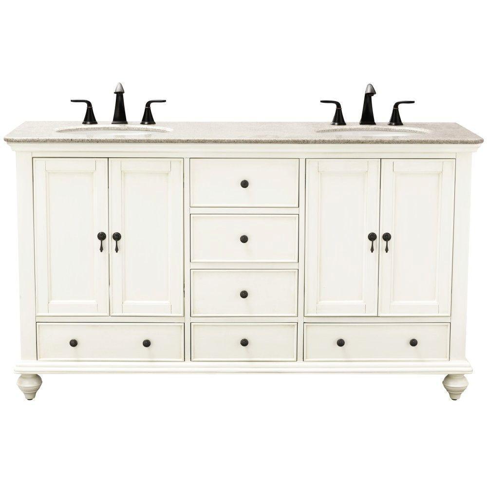 Double bath vanities offer plenty of storage and elbow room for the couple's bath. Our Newport Double Bath Vanity is rich in both space and style. Each white under-mount sink sits above a two-door cabinet with recessed panels and teardrop door pulls. Below each cabinet is a wide drawer; four smaller drawers stack in a column between the cabinets. Finished with crown and foot molding, ball feet and a granite top, this bathroom vanity has classic appeal with a versatility that ingratiates it to modern decor. As the vanity top is crafted of real granite, it may contain swirling or veining. These features are part of the natural beauty of stone and have no effect on function or durability.