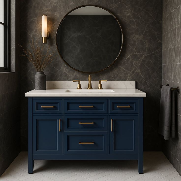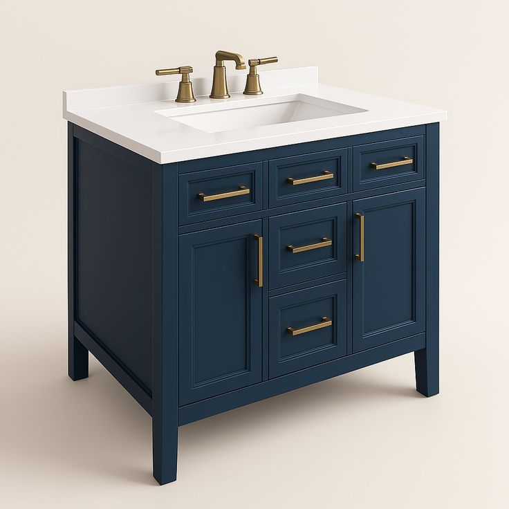 The Mayfield 42-inch vanity by Home Decorators Collection combines transitional style with practical functionality. Featuring a Grayish Blue finish, brass hardware, and an engineered stone countertop, this vanity offers ample storage with 5 drawers and 2 cabinets.