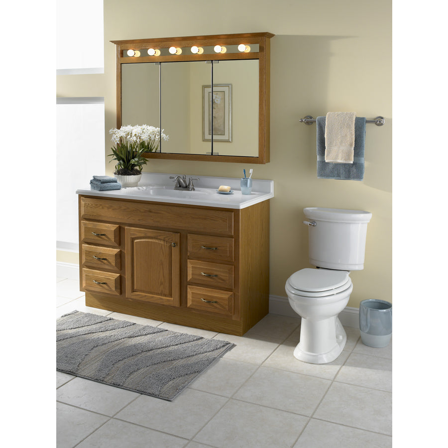 White premium cultured marble vanity top blends well with most bath decor Integral oval bowl for a seamless one-piece design 49-in W x 22-in D vanity top Pre-drilled for 4-in centerset faucets for easy installation (faucet sold separately) Integrated backsplash protects walls from water damage Ogee edge profile offers a classic and traditional look Fits 48-in W x 21-in D vanity cabinets Matching side splash available (sold separately)