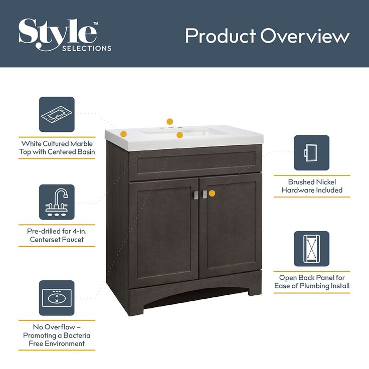 Upgrade your bathroom with the Style Selections Drayden 30.5-in Heirloom Single Sink Bathroom Vanity. This stunning piece features a luxurious design that will instantly elevate the look and feel of your space. Crafted from high-quality materials, this vanity is built to last and withstand the rigors of daily use. The heirloom finish adds a touch of elegance, while the white cultured marble top complements any decor style.