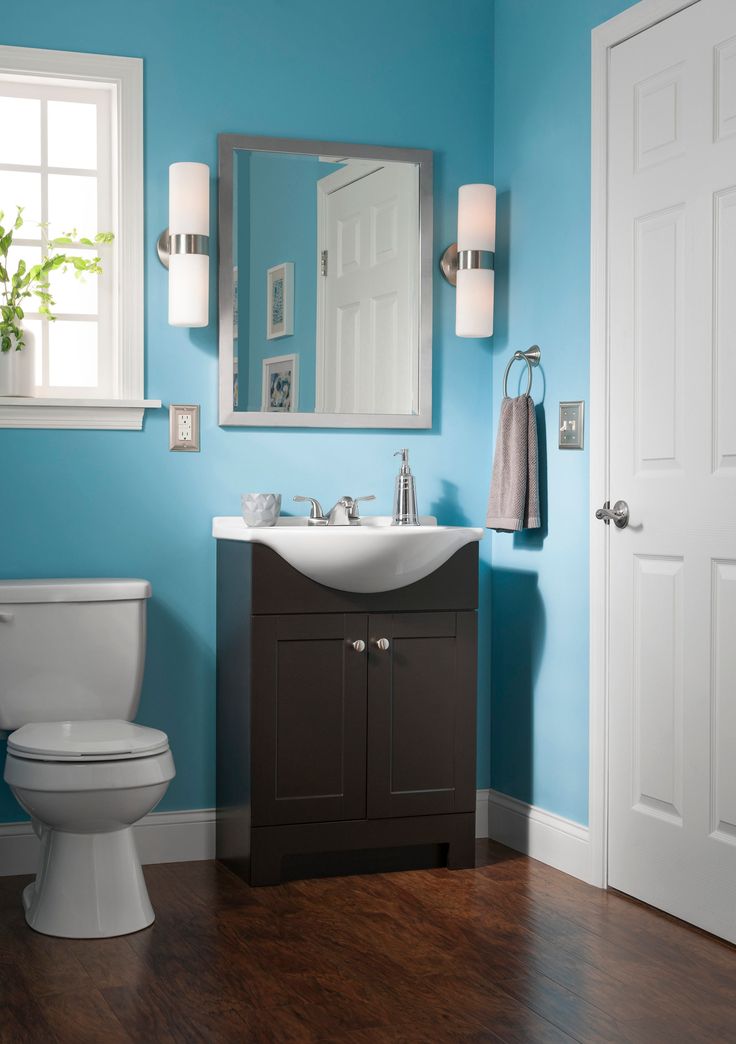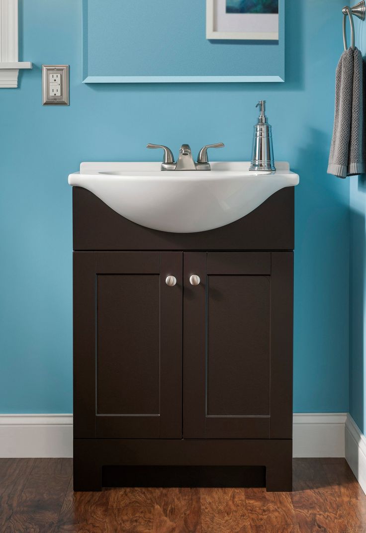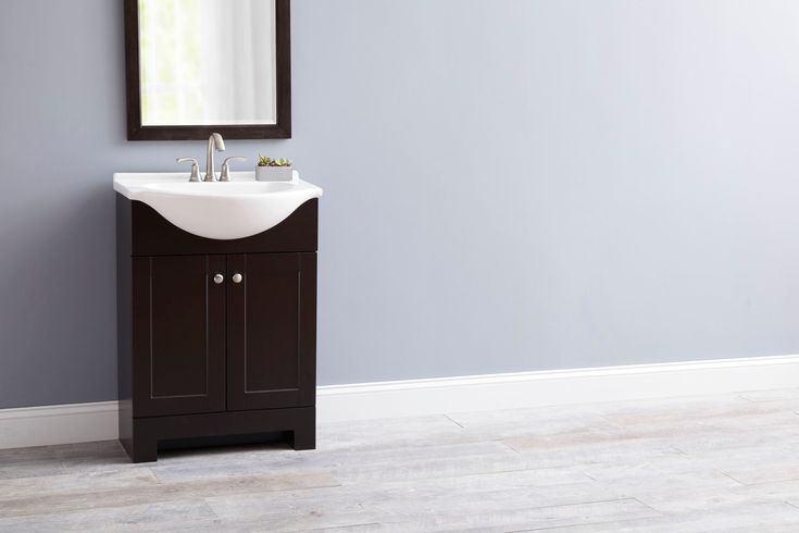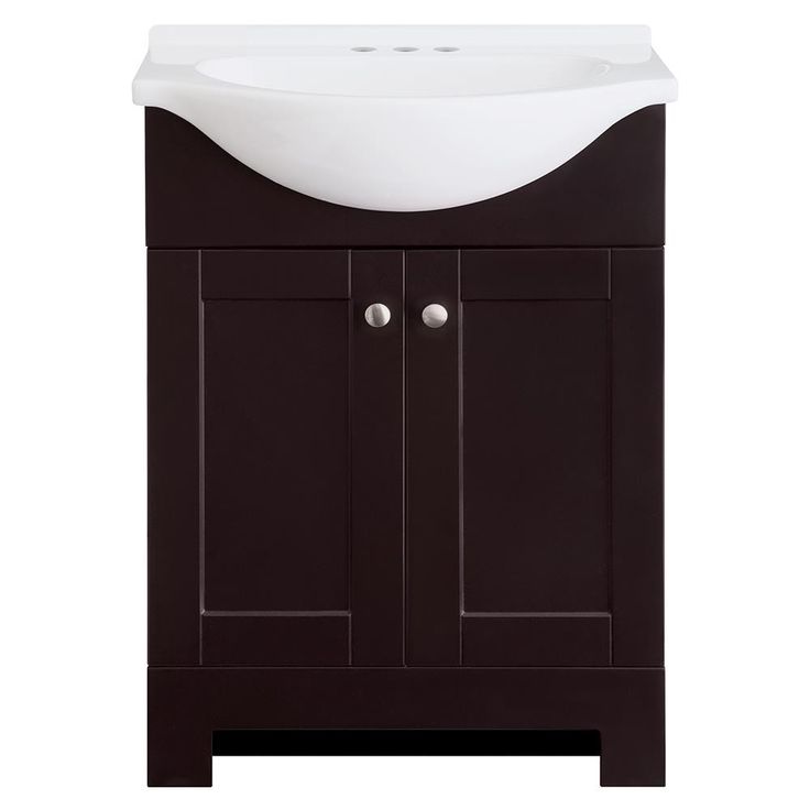 Espresso finish vanity from the Euro collection gives your space a cool, modern feel White cultured marble top with a seamless integrated bowl Satin nickel finish hardware adds a touch of glimmer Great for traditional style bathrooms and powder rooms Two doors with adjustable concealed hinges allow you to store bath products under the sink Furniture-style toe kick opens up floor space and European-inspired frameless construction allows for easy installation 25-In W x 18.6-in D bathroom vanity with top included Pre-drilled for a 4-in centerset faucet for easy installation (faucet sold separately) Fully assembled and ready to be installed