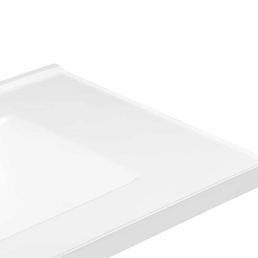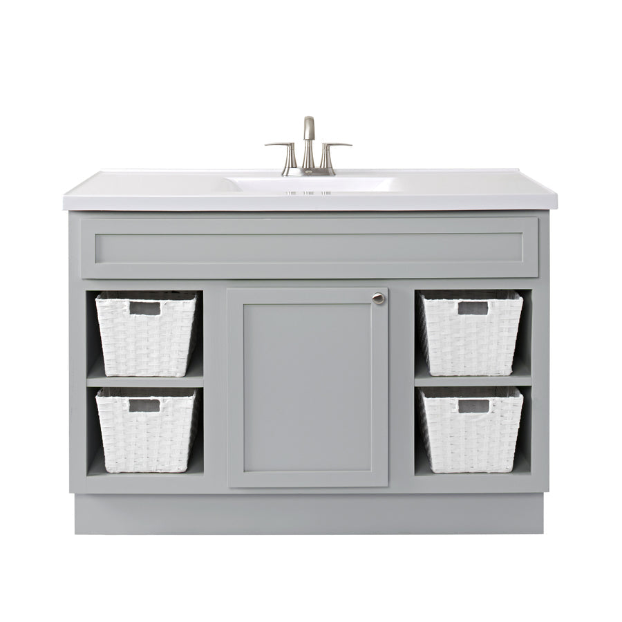 White premium cultured marble vanity top blends well with most bath decor Integral rectangular bowl for a seamless one-piece design 49-in W x 22-in D vanity top Pre-drilled for 4-in centerset faucets for easy installation (faucet sold separately) Dripless edge keeps water from running off top Fits 48-in W x 21-in D vanity cabinets
