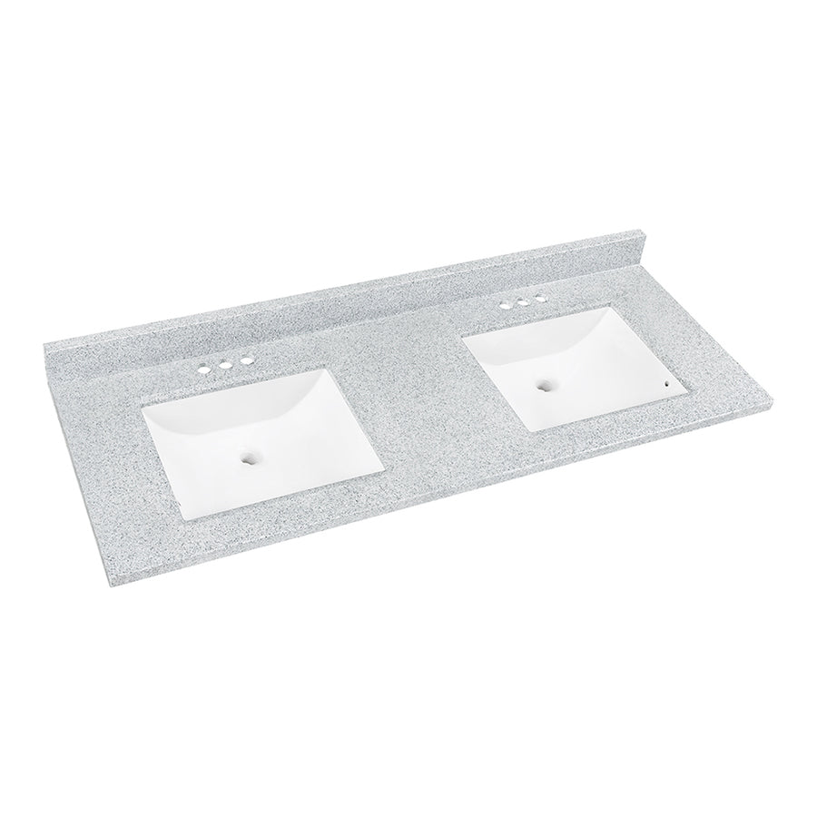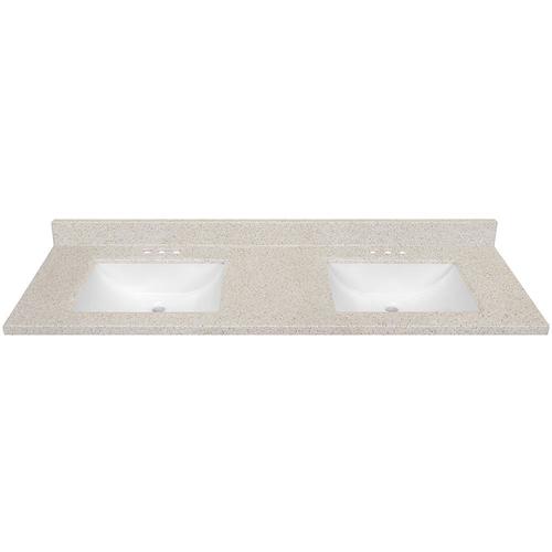 Dune solid surface technology vanity top is durable White seamless integral rectangular sinks for easy cleaning Integrated backsplash protects walls from water damage Flat edge profile offers a more contemporary look 61-in W x 22 in D bathroom vanity top fits 60-in W x 21-in D vanity cabinets Pre-drilled for a 4-in centerset faucet for easy installation Matching side splash available, sold separately Faucet and drain sold separately