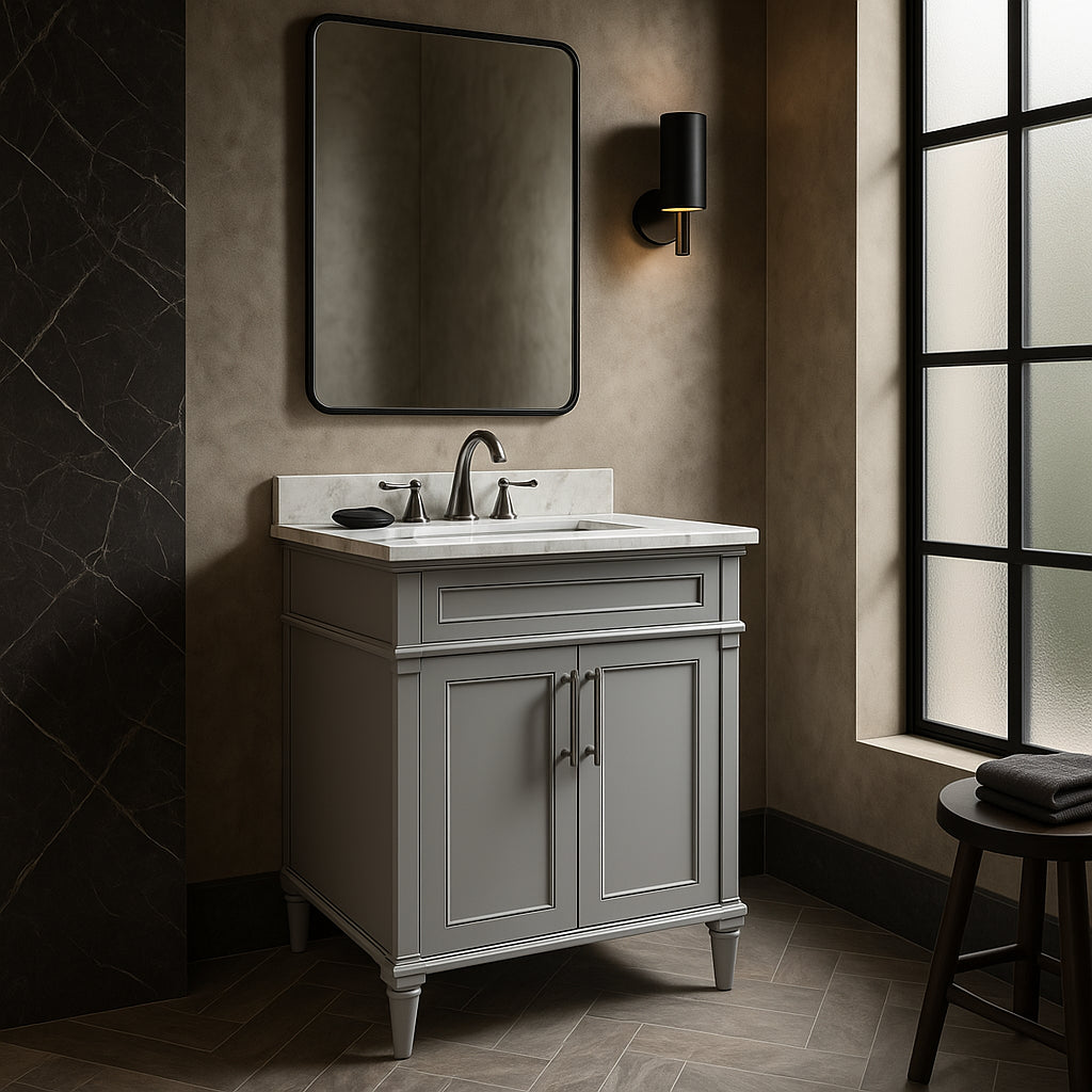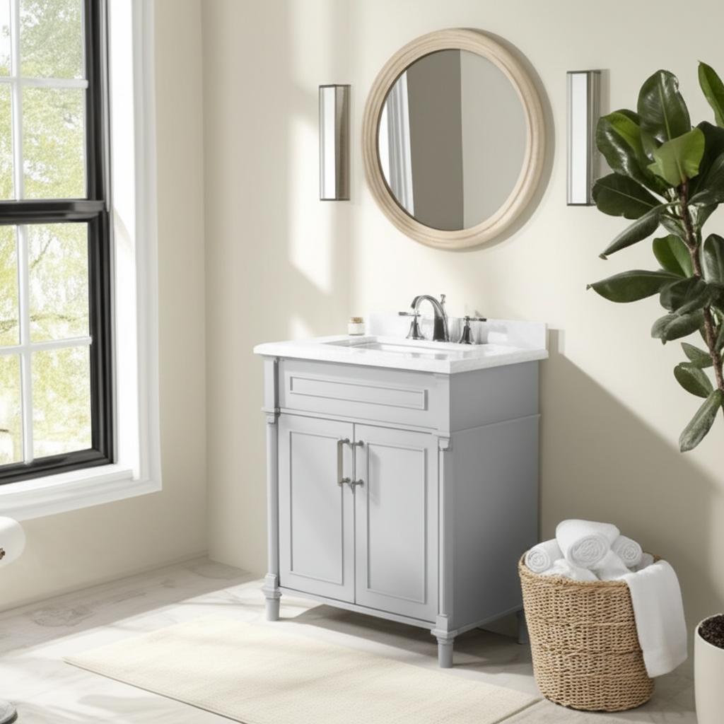 The Aberdeen 30" Dove Gray Vanity combines timeless design with modern functionality. Featuring a Carrara marble top, soft-close doors, and ample storage, it is perfect for enhancing any bathroom space.