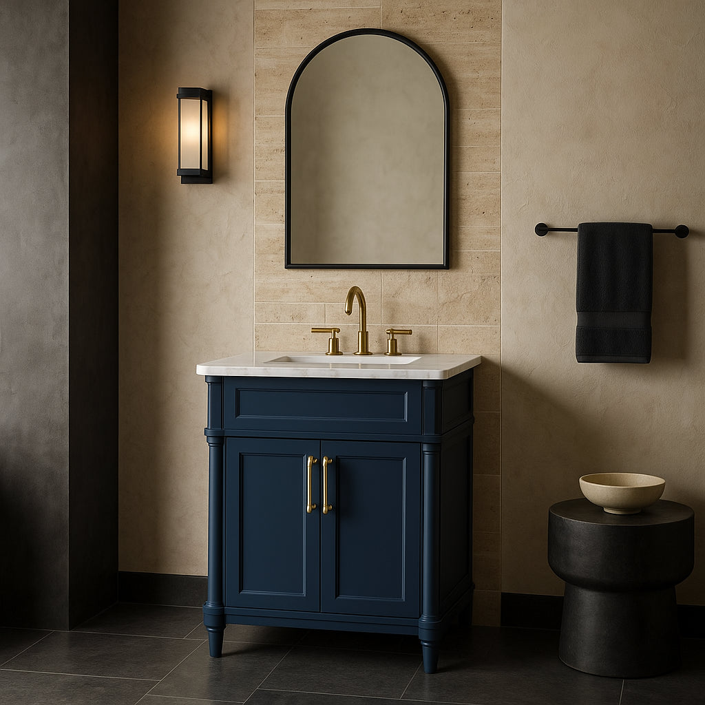 The Aberdeen 30" vanity combines timeless design with modern functionality, featuring a midnight blue finish, Carrara marble top, and gold hardware. Perfect for elevating any bathroom space.