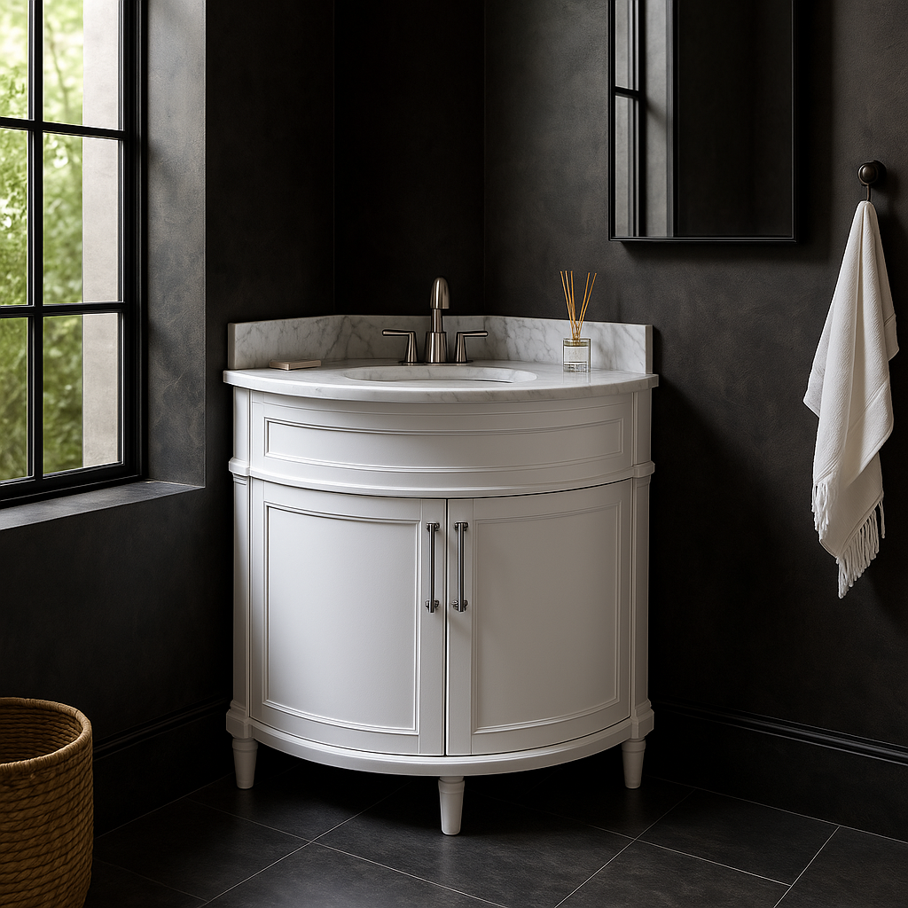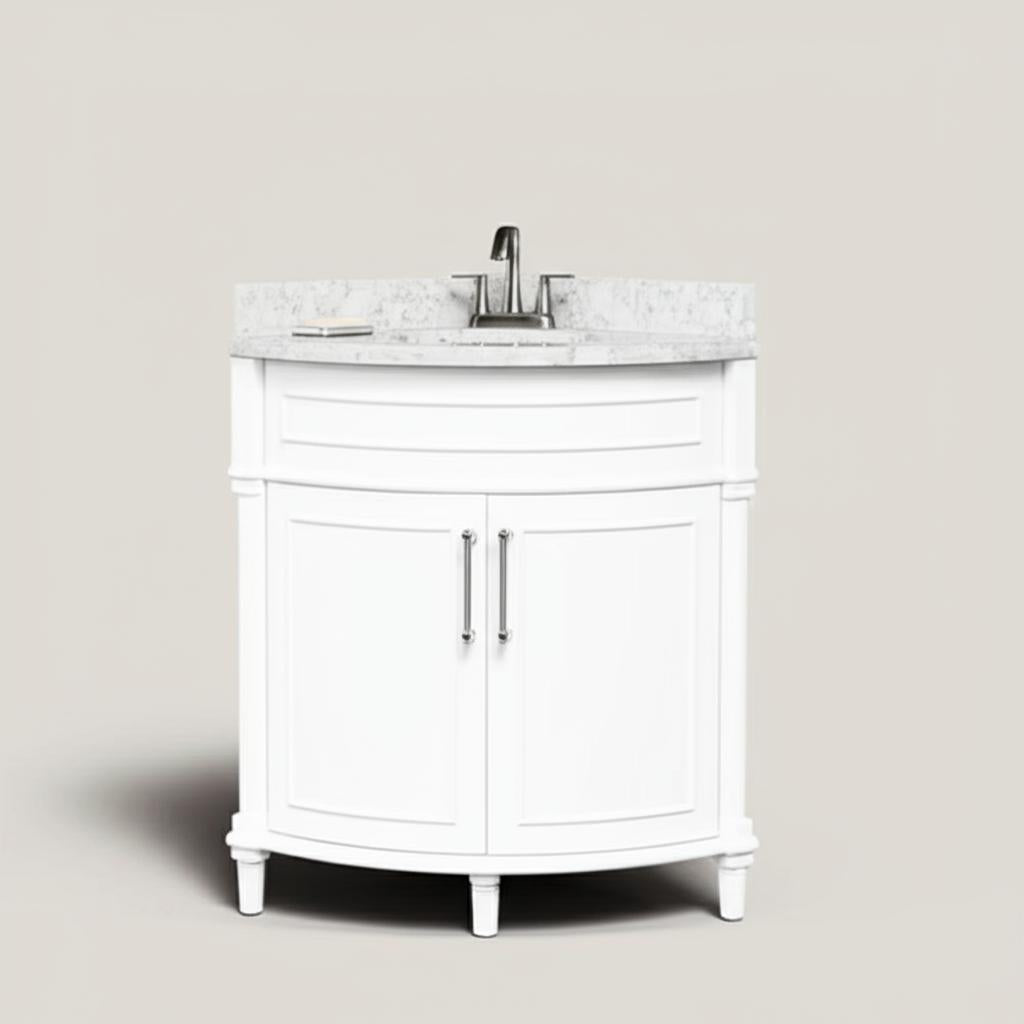 The Aberdeen 32-inch corner vanity combines elegant design with practical functionality. Featuring a Carrara marble countertop, soft-close doors, and chrome hardware, this vanity is perfect for enhancing small bathroom spaces.