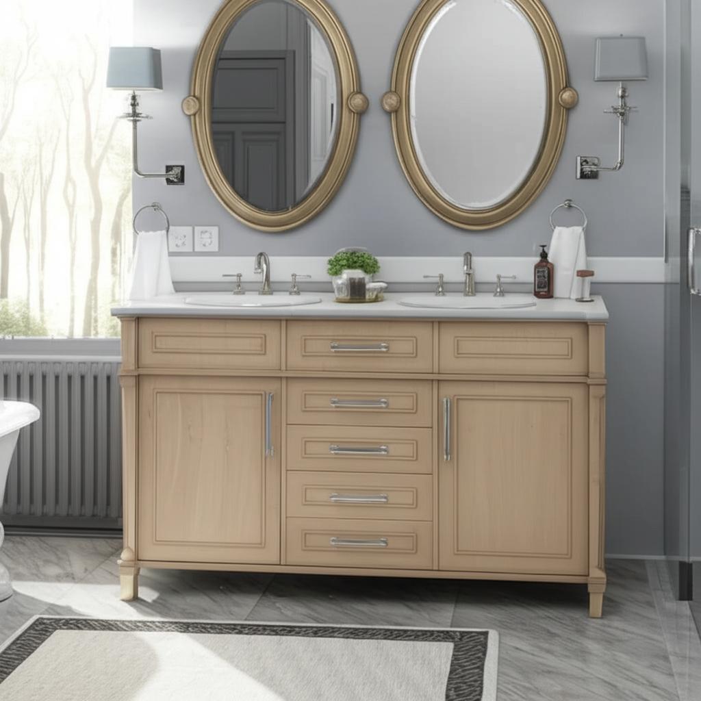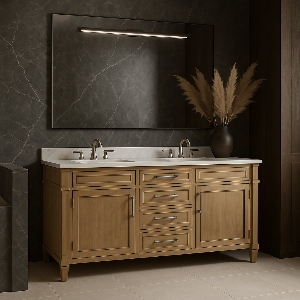 The Aberdeen 60-inch Double Sink Vanity combines transitional design with premium materials, featuring an antique oak finish, Carrara marble countertop, and ample storage with soft-close drawers and doors.