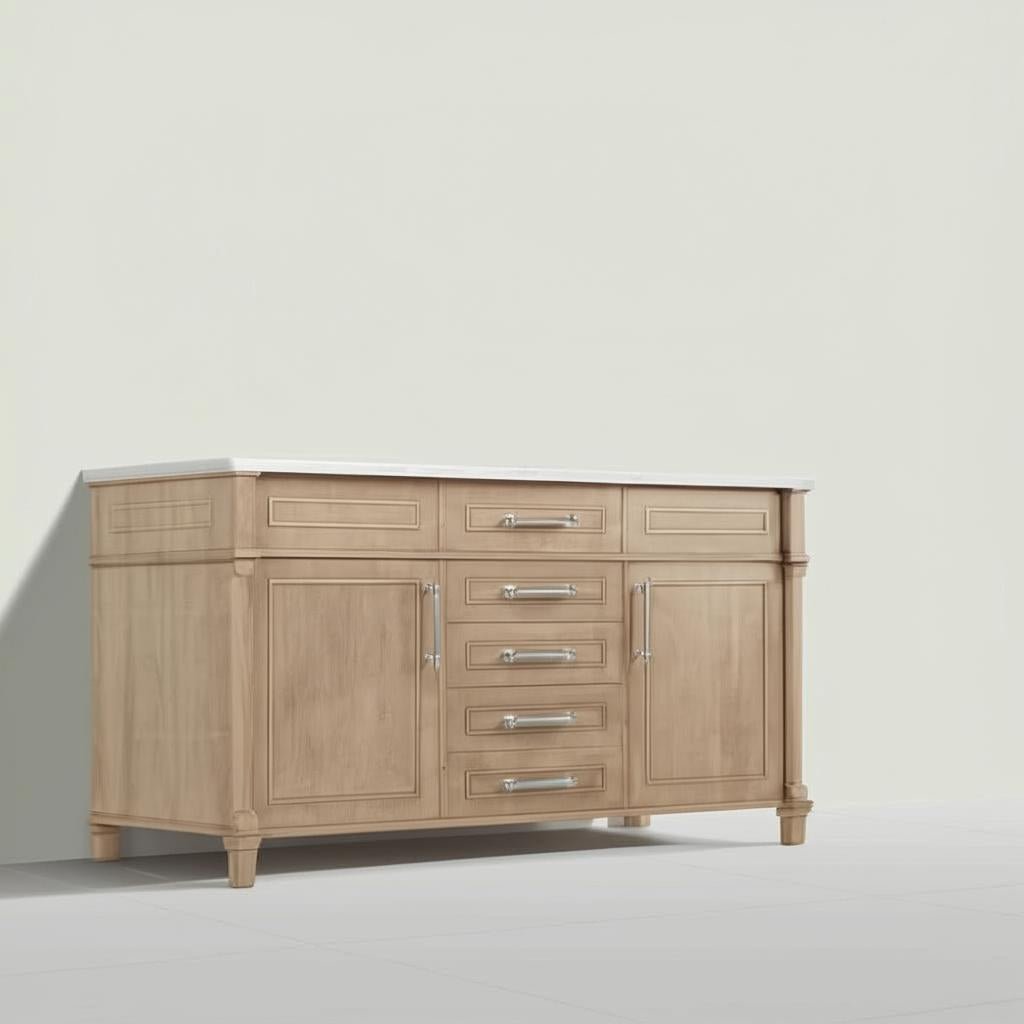 Transform your bathroom into a sanctuary of sophistication with the Aberdeen 60-inch Double Sink Vanity. Its antique oak finish and Carrara marble countertop exude timeless elegance, while the soft-close drawers and doors ensure a seamless experience. Pair it with minimalist decor to highlight its transitional design, or complement it with vintage accents for a classic look. This vanity is not just a fixture; it's a statement of luxurious living.