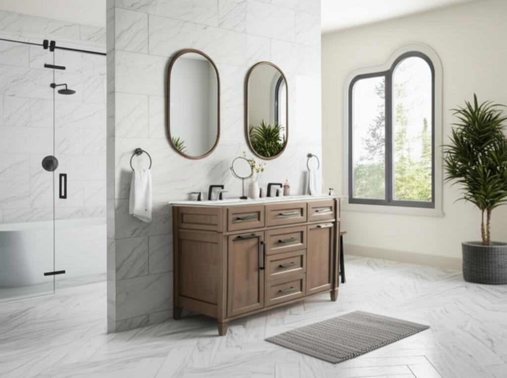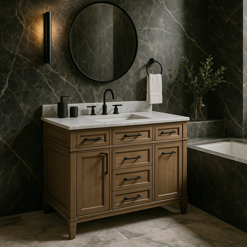 The Caville 48-inch vanity combines traditional elegance with modern functionality, featuring an Almond Latte finish, Carrara marble top, and integrated storage solutions.