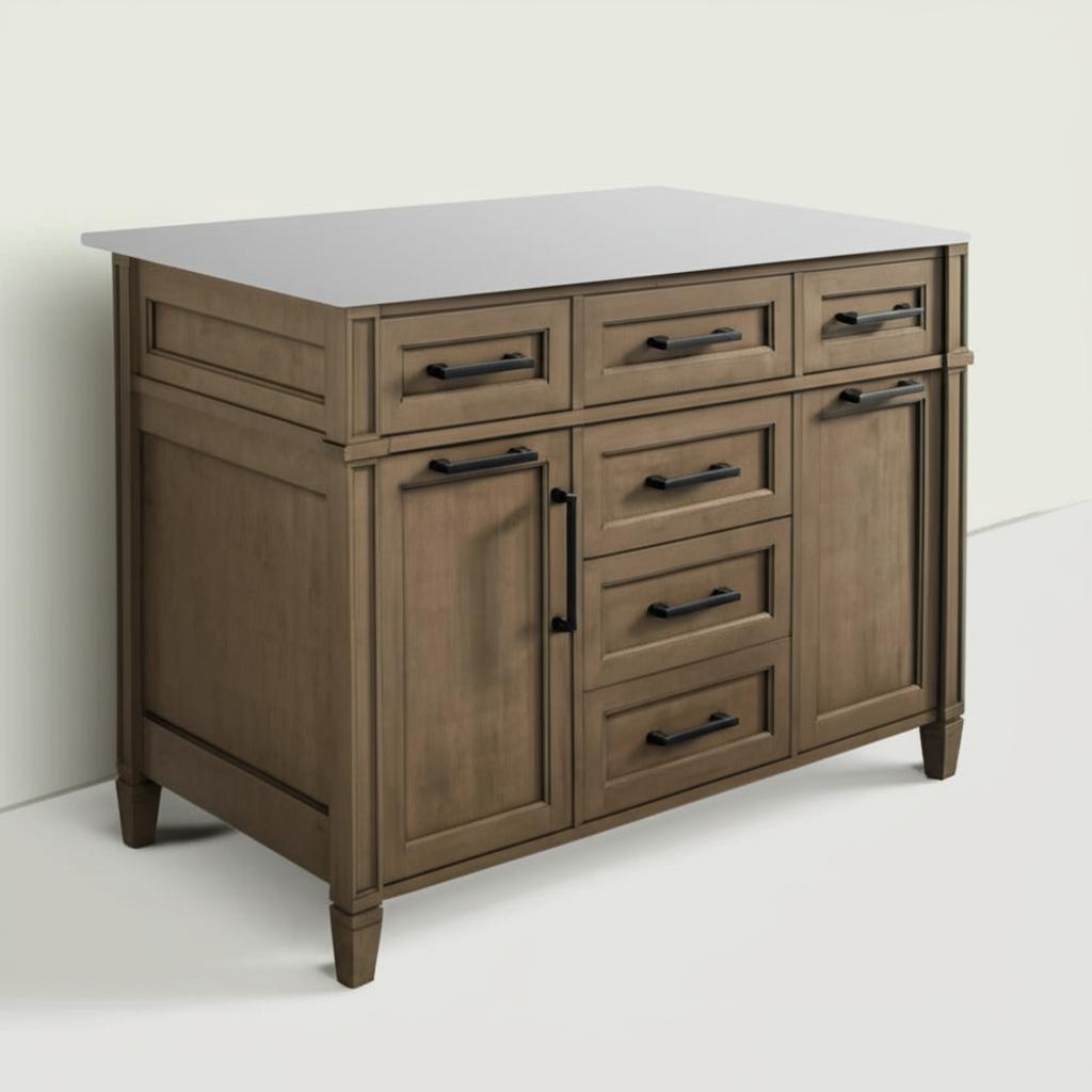 The Caville 48-inch vanity is a masterpiece of traditional design, blending the warm Almond Latte finish with the luxurious Carrara marble top. Its thoughtful storage solutions, including integrated electrical outlets and USB ports, make it a modern essential. Style it with sleek black or brushed nickel hardware to complement its timeless appeal. This vanity is not just a fixture; it's a statement of refined living.
