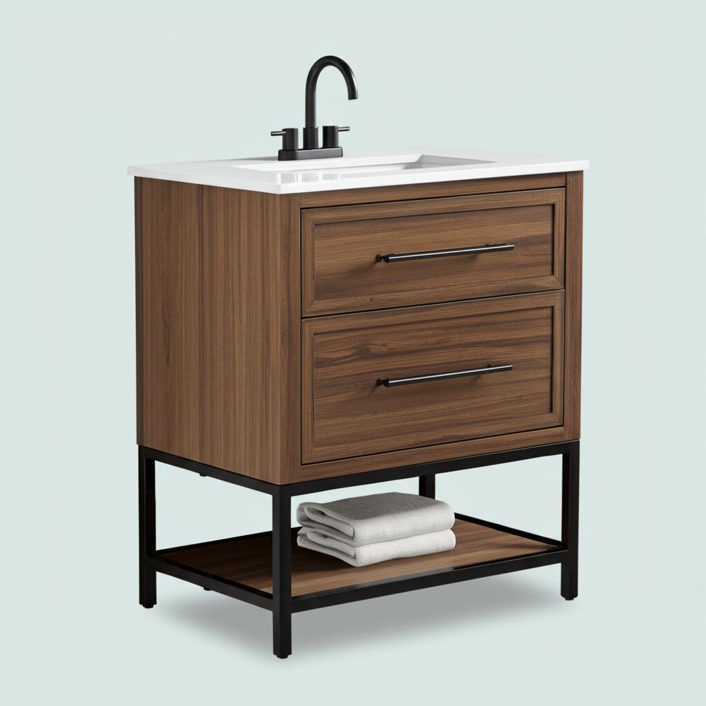 The Corley vanity combines a spiced walnut finish with a sleek engineered stone countertop, offering a modern farmhouse aesthetic. Featuring soft-close drawers and an open shelf, it provides both style and functionality for your bathroom.