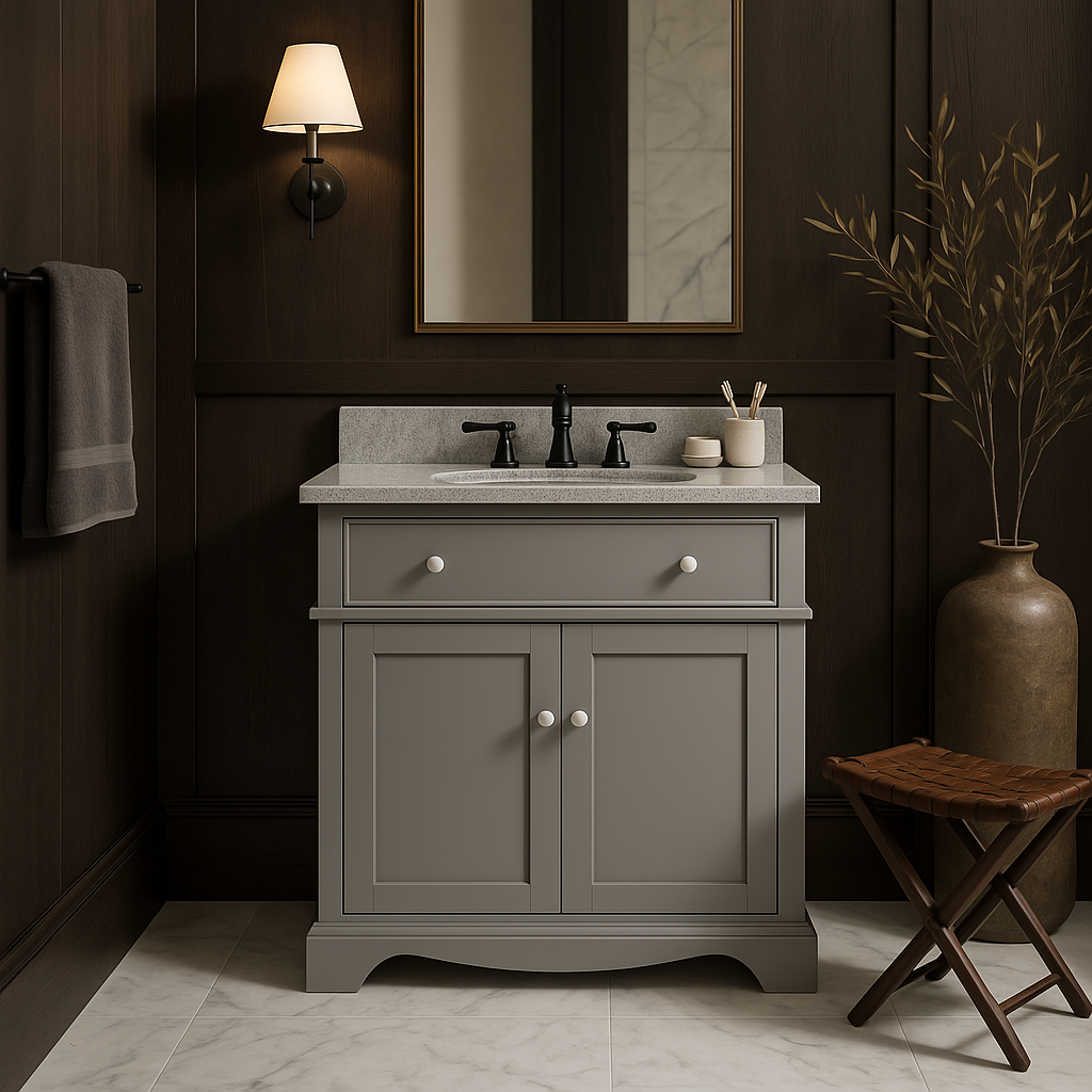 Elevate your bathroom with the Fremont Vanity, a masterpiece of design and functionality. Its smooth gray finish and white knobs exude sophistication, while the granite top adds a touch of luxury. Pair it with a sleek mirror and modern lighting to create a serene and stylish retreat. This vanity is not just a fixture; it's a statement of refined taste.