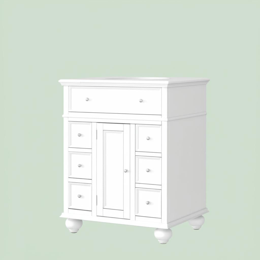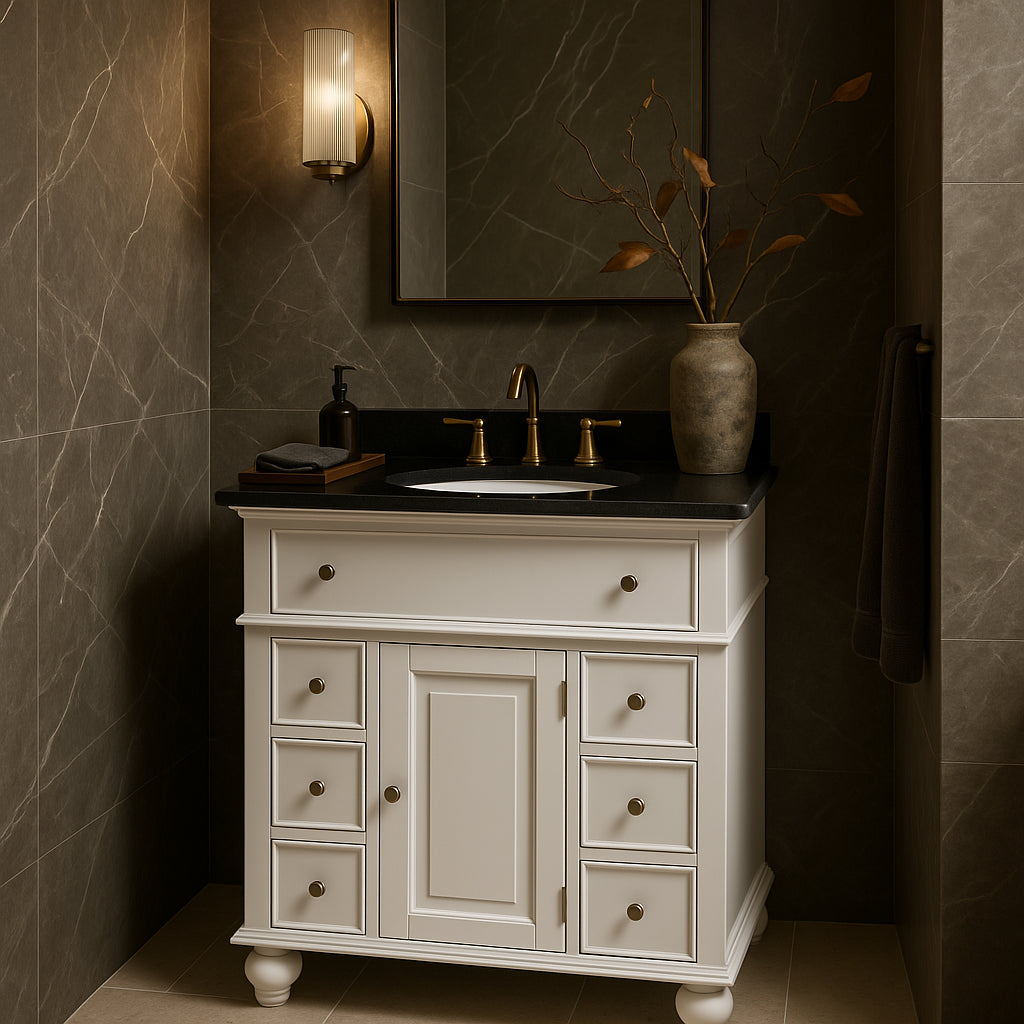 Elevate your bathroom's aesthetic with this exquisite vanity, blending traditional charm with modern functionality. The recessed paneling and crown molding create a timeless appeal, while the hand-polished granite top adds a touch of luxury. Pair it with a classic mirror and soft lighting to create a serene and inviting space. This vanity is not just a fixture; it's a statement of refined taste and practical elegance.