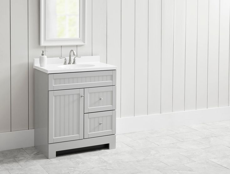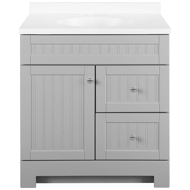 The Style Selections Ellenbee 30.5-in Gray Single Sink Bathroom Vanity with White Cultured Marble Top is the perfect addition to any modern bathroom. The sleek gray finish and white cultured marble top create an elegant and contemporary look that will elevate the style of any bathroom. The vanity features two drawers and an open bottom shelf, providing ample storage space for all of your bathroom essentials. The drawers are equipped with smooth gliding tracks, making it easy to access your items. The bottom shelf is perfect for storing towels or displaying decorative items.