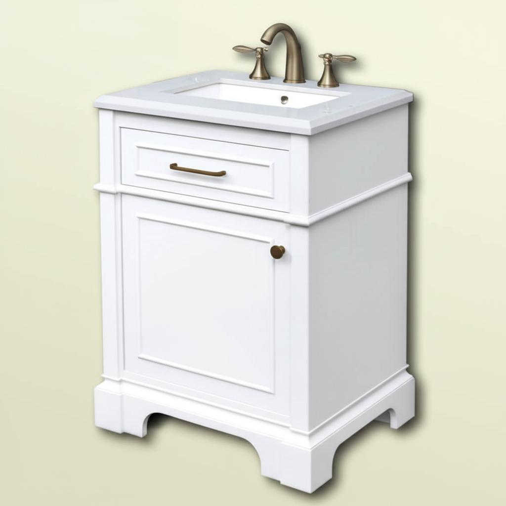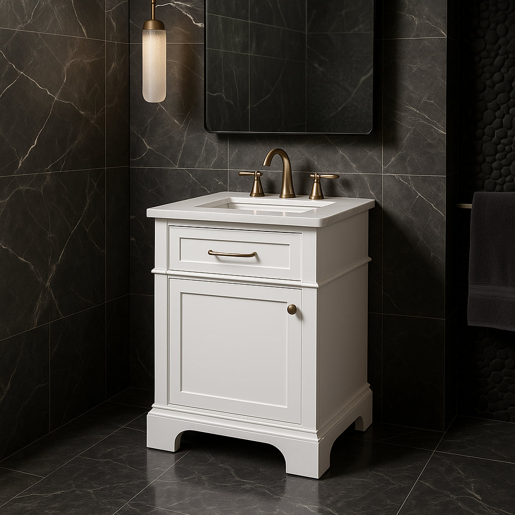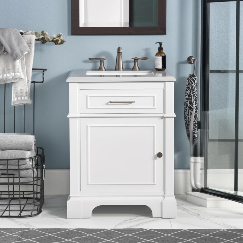 The Melpark 24-inch vanity combines modern regality with practical design. Featuring a crisp white finish, engineered marble top, and versatile brushed nickel and gold hardware, it offers both style and functionality. Perfect for enhancing any bathroom space.