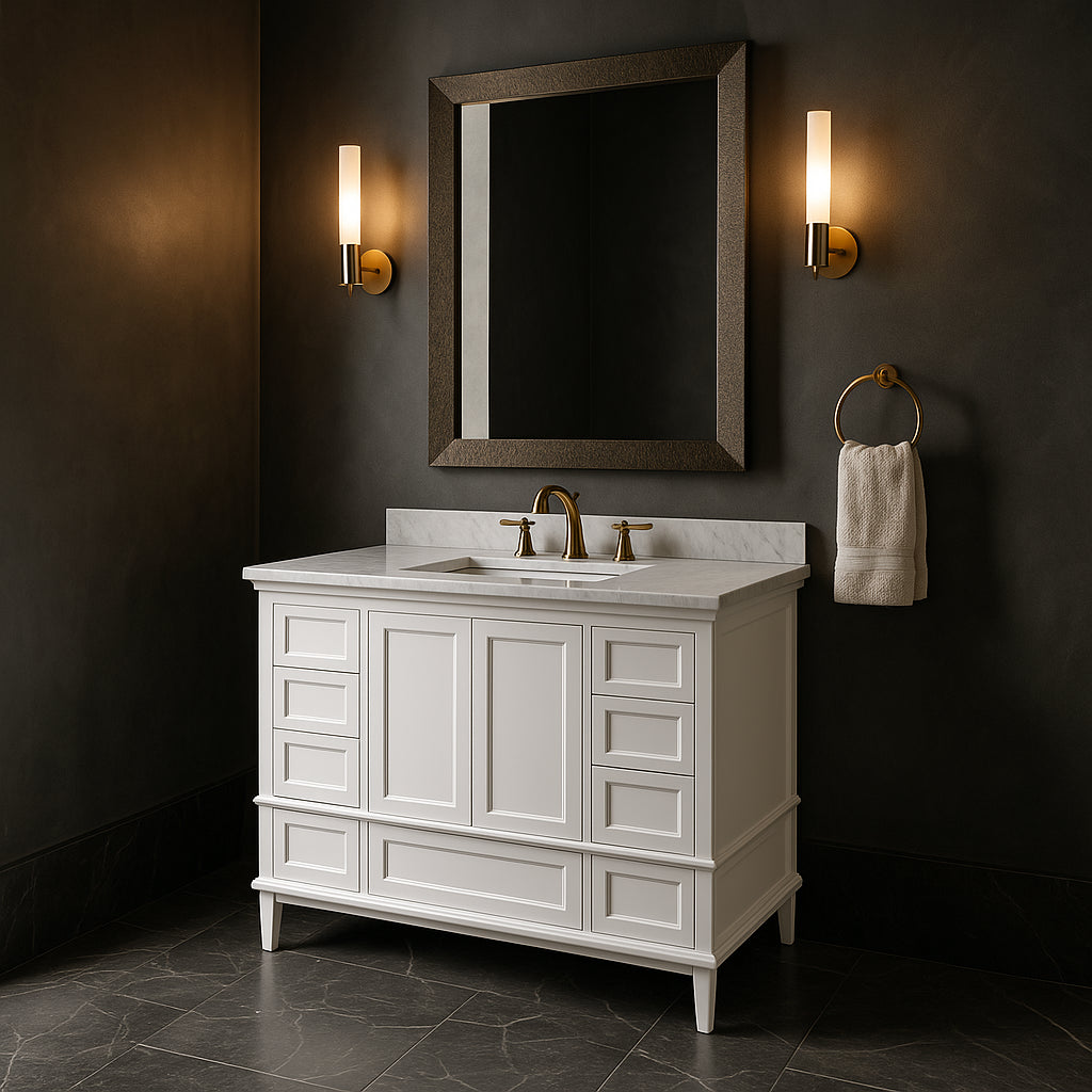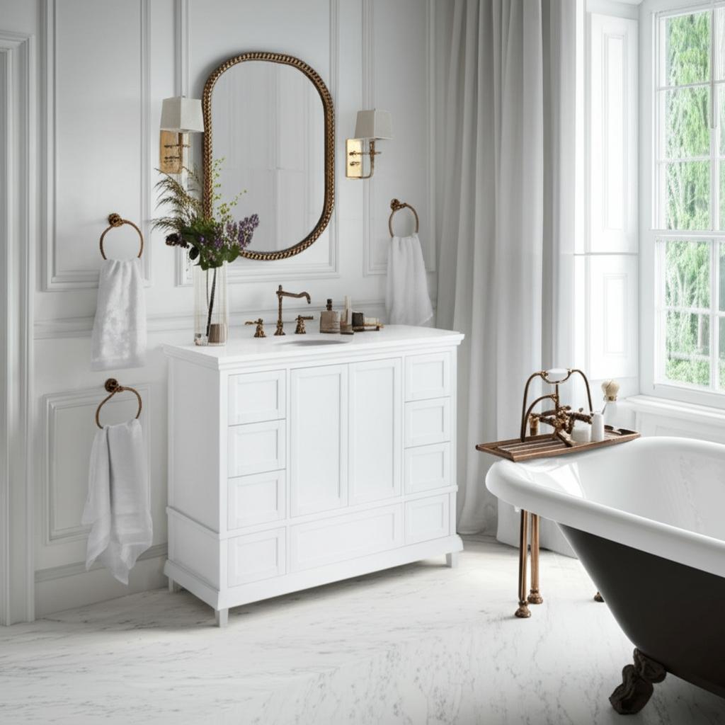The Merryfield 43-inch Bath Vanity combines classic design with modern functionality. Featuring a Carrara marble top, matte black hardware, and ample storage, this vanity is perfect for elevating any bathroom space.