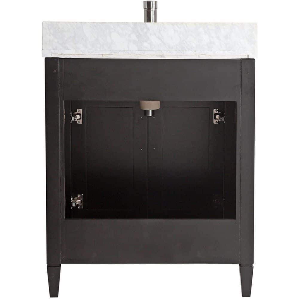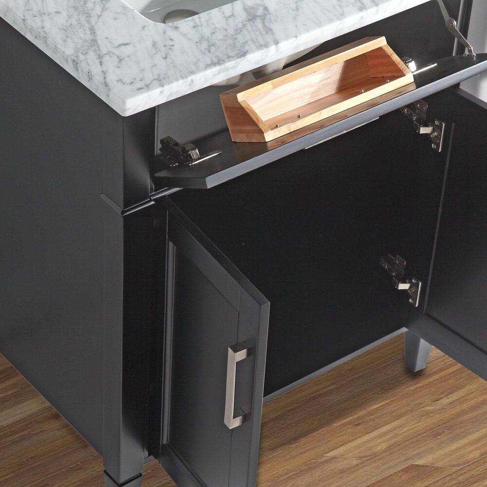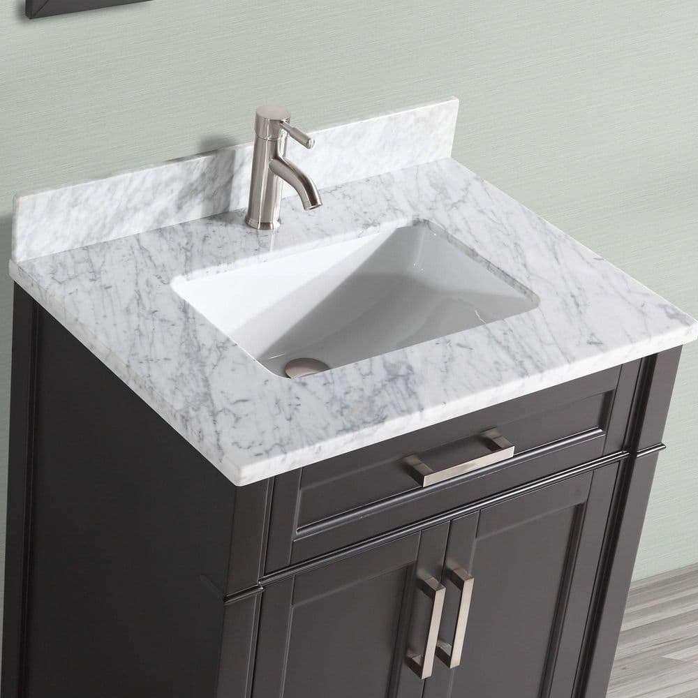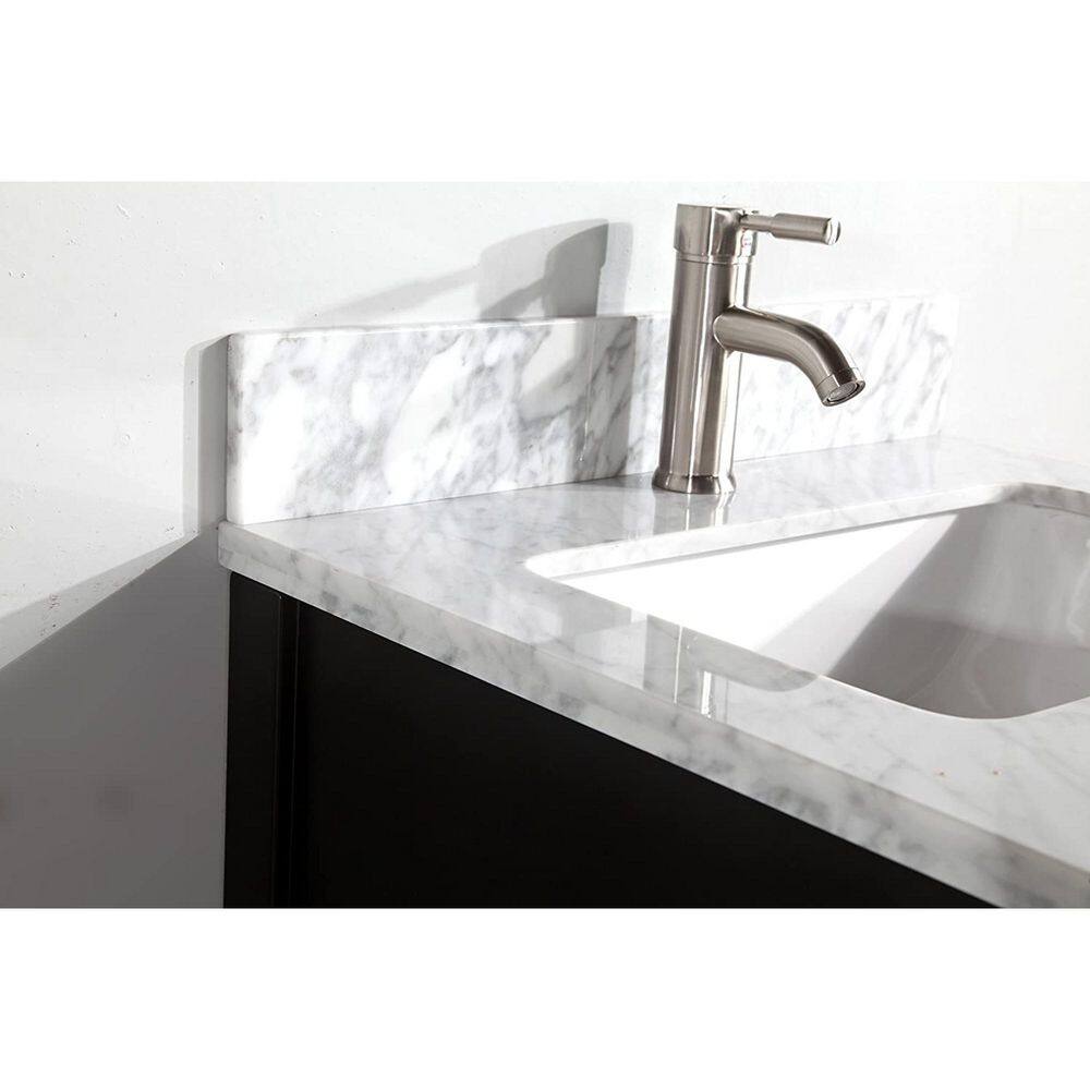 • Complete Set: Vanity cabinet, white Carrara marble top with backsplash, undermount sink, and matching mirror included