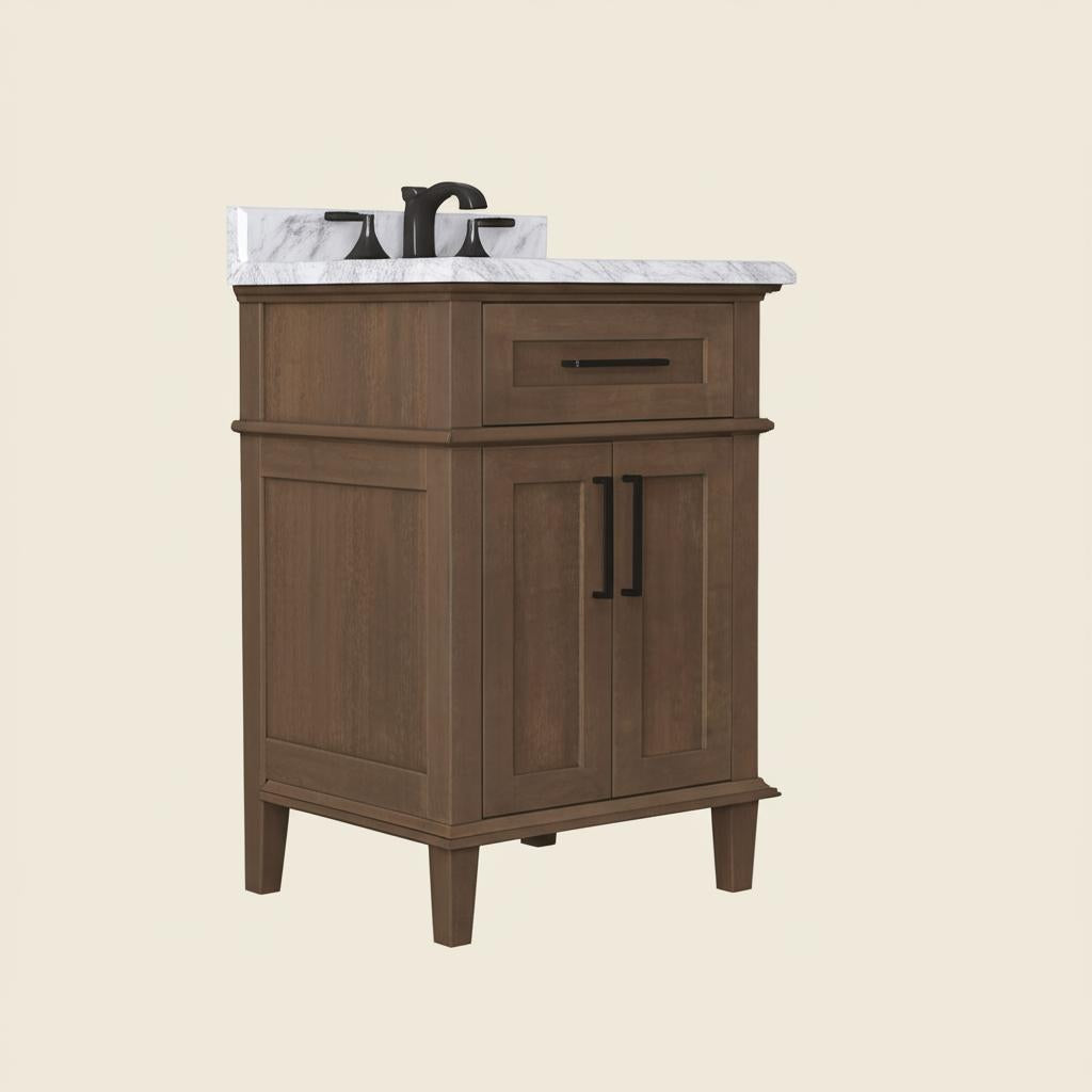 The Sonoma 24-inch vanity combines modern design with practical features, including a Carrara Marble top, soft-close doors, and an adjustable shelf. Perfect for enhancing your bathroom's style and functionality.