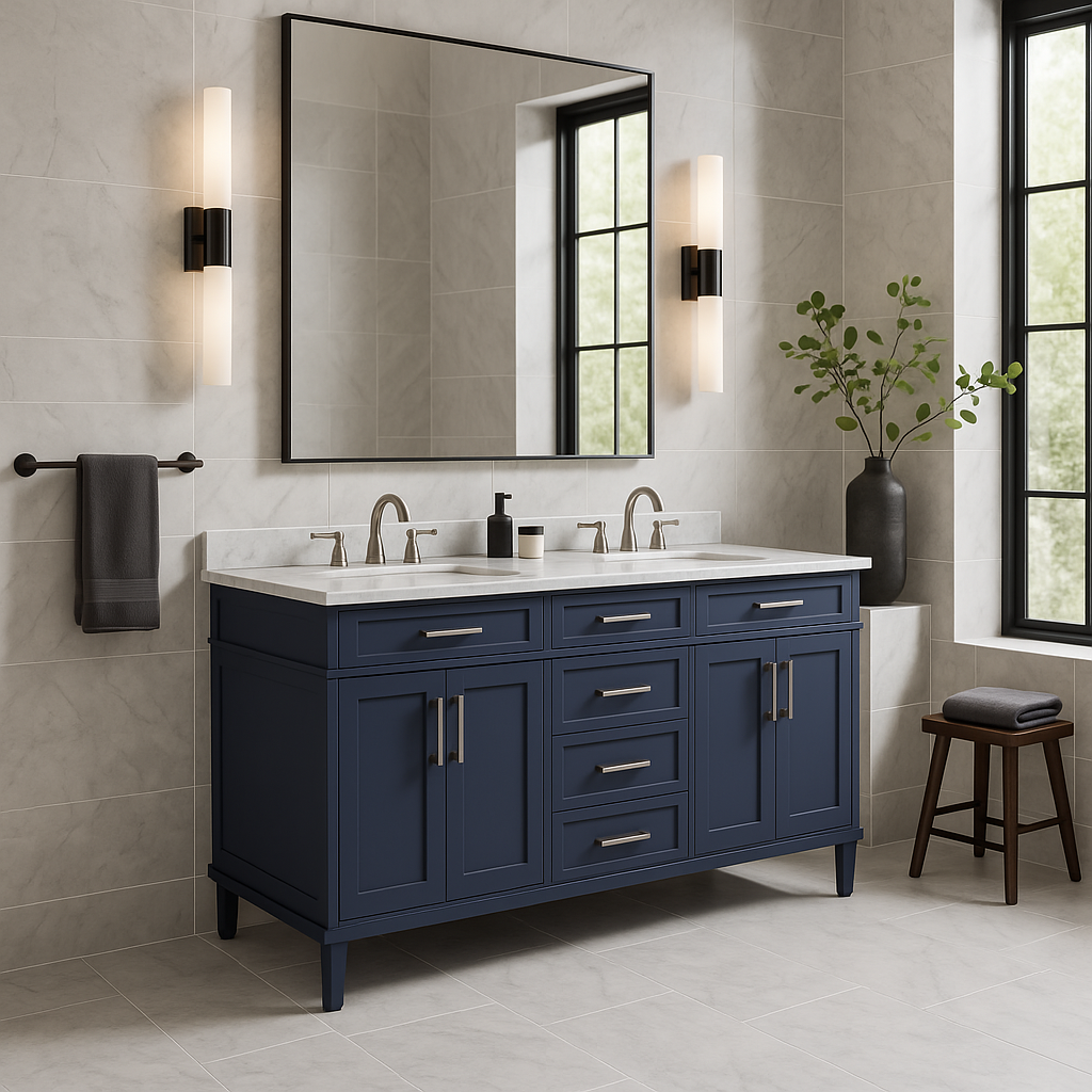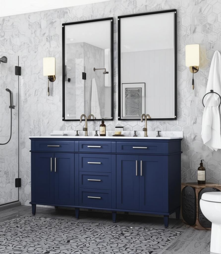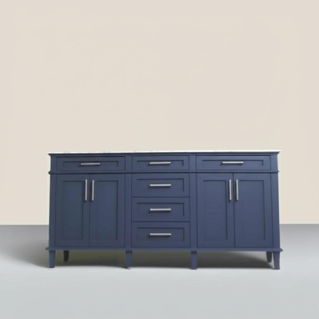 The Sonoma 72-inch vanity combines modern design with functional elegance. Featuring a Midnight Blue finish and Carrara Marble countertop, it offers ample storage and soft-close mechanisms for a seamless bathroom experience.