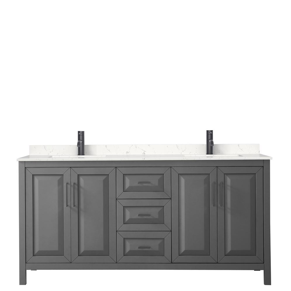 A transitional double-sink vanity from Wyndham Collection’s Daria line, finished in dark gray with a water-resistant, low-VOC sealed finish. Built from solid wood, plywood, and MDF to resist warping, it offers generous storage with soft-close doors and drawers and pairs with optional mirrors or medicine cabinets.