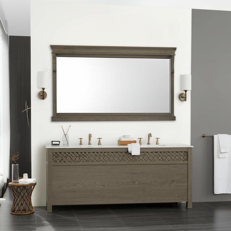 This mirror is a statement piece that elevates any bathroom with its timeless design and distressed grey finish. The subtle architectural detailing of the frame adds a touch of sophistication, making it a perfect complement to rustic or cottage-style interiors. Pair it with a matching vanity for a cohesive look, or let it stand out as a focal point in a minimalist space. Its blend of functionality and style makes it an essential addition to luxurious living.