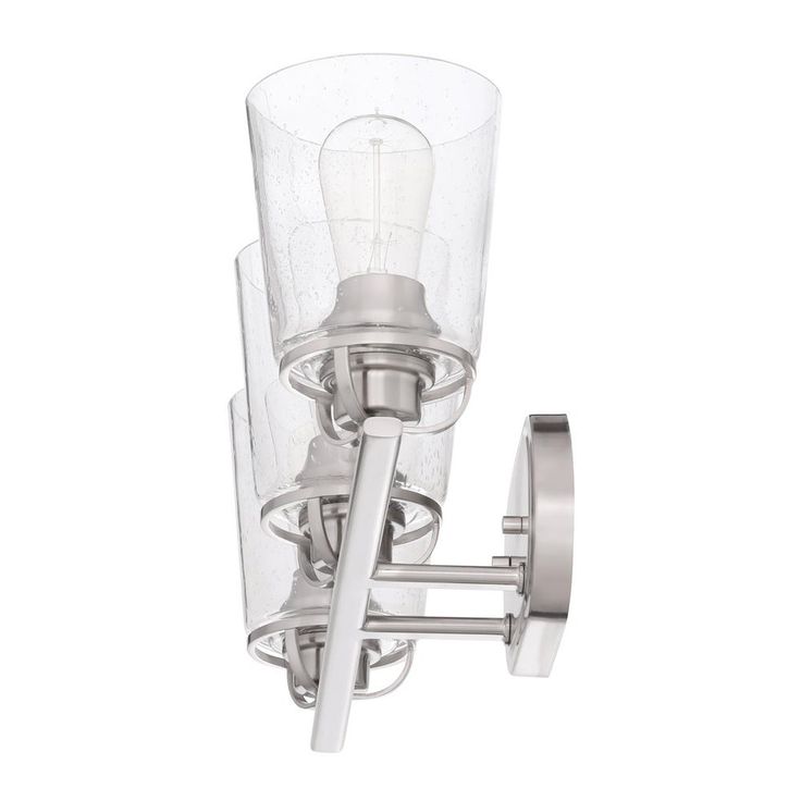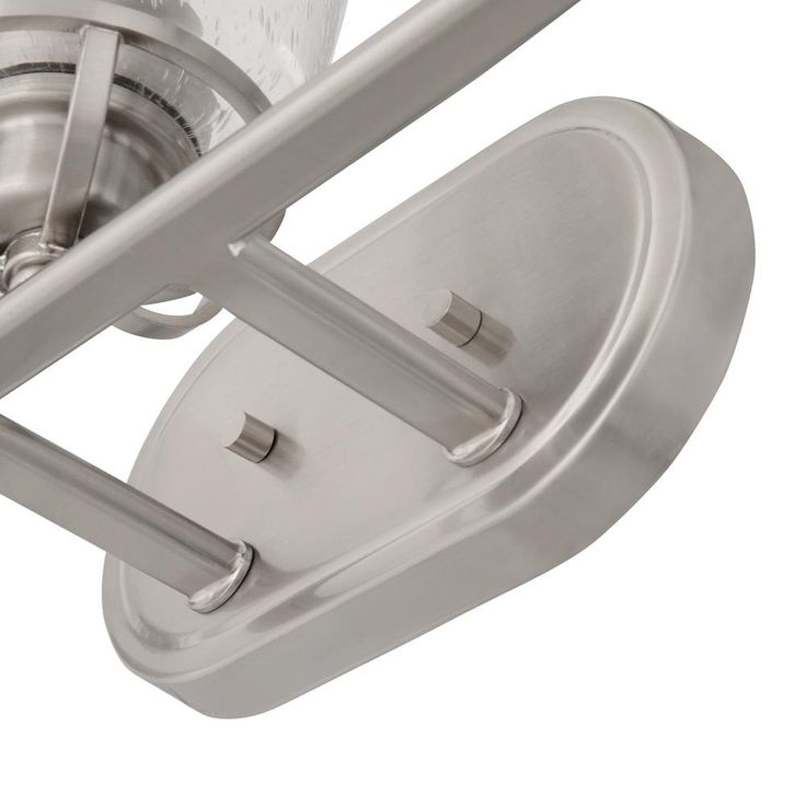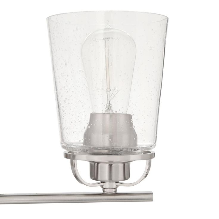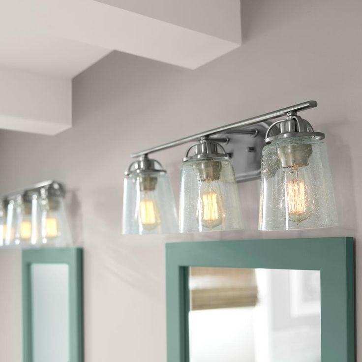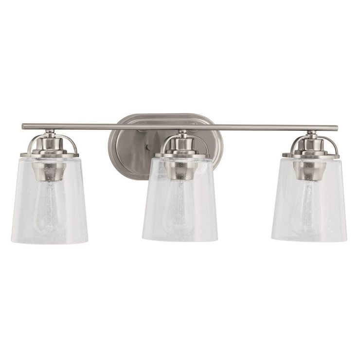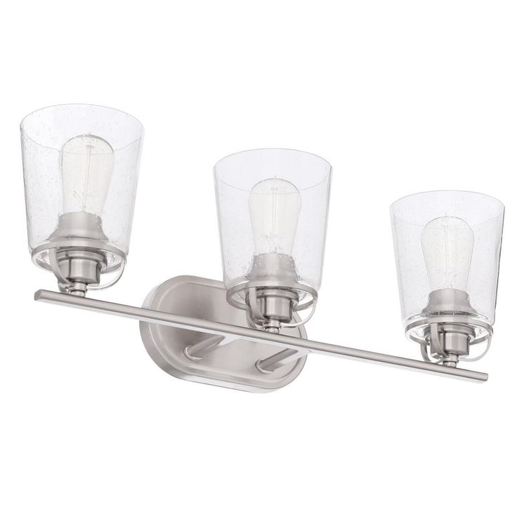 A modern form with industrial-inspired accents. Visual interest continues with a linear frame that holds each clear seeded glass shade. A Brushed Nickel finish highlights this 3-Light vanity fixture.