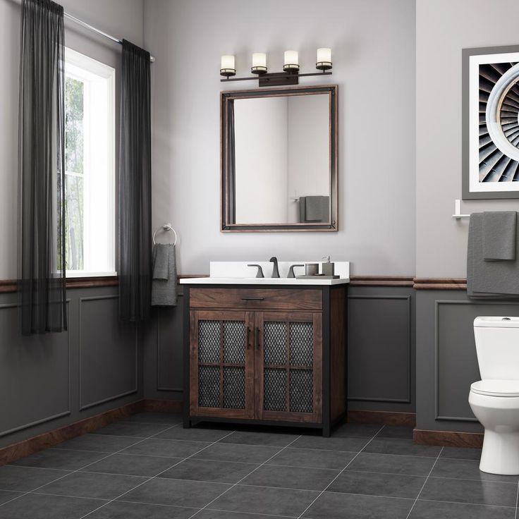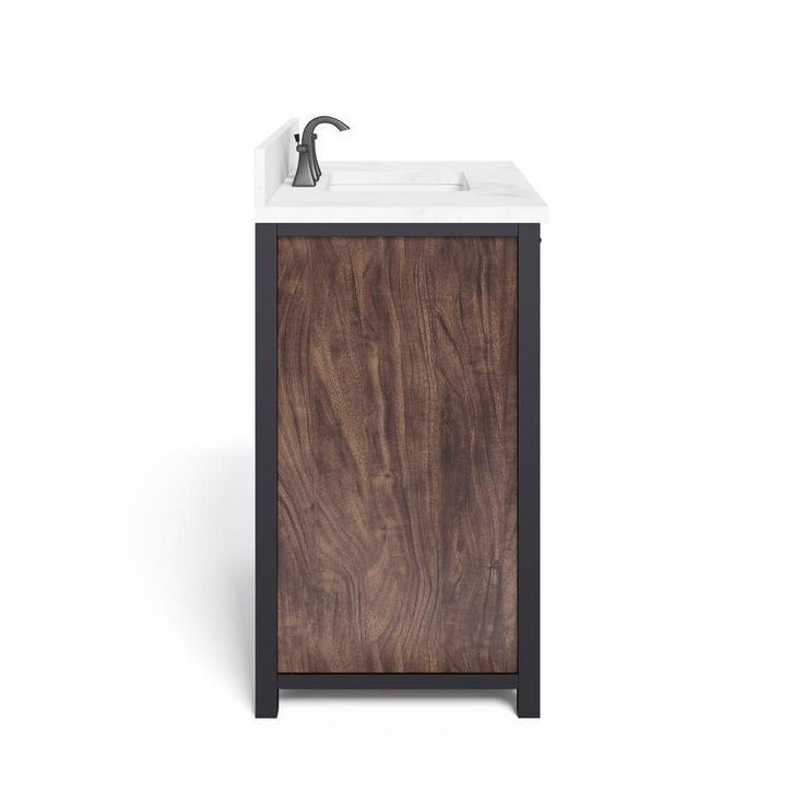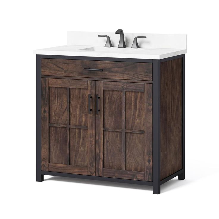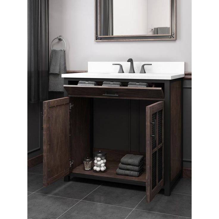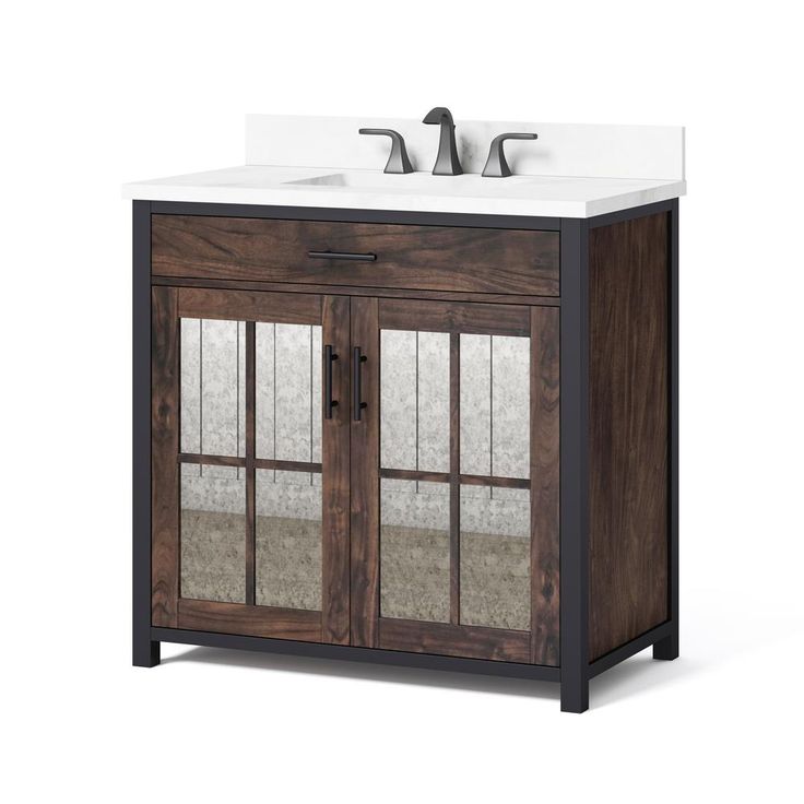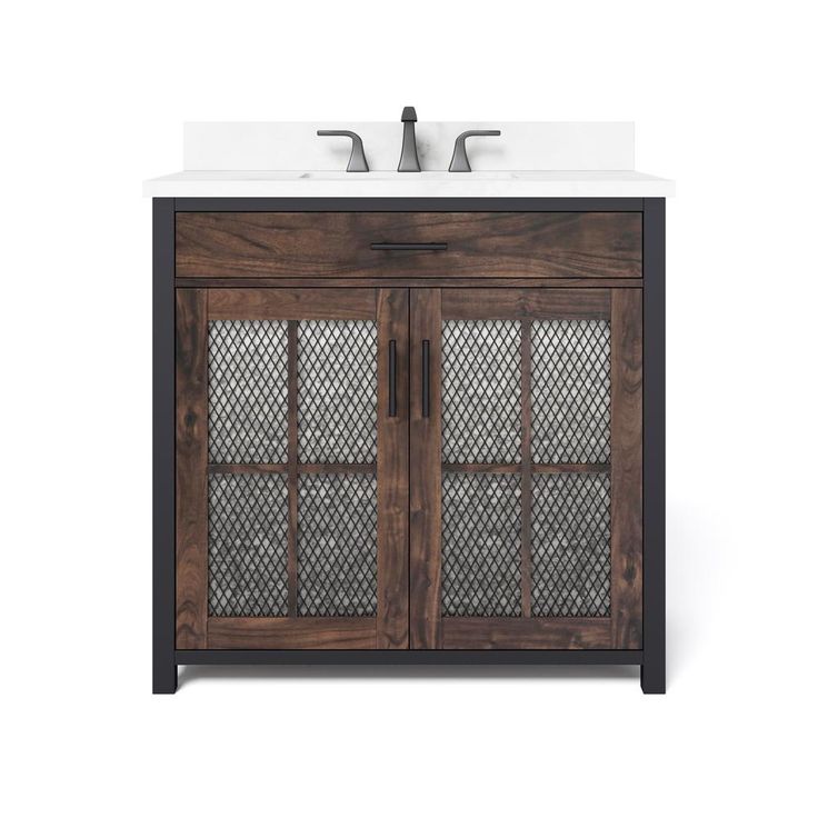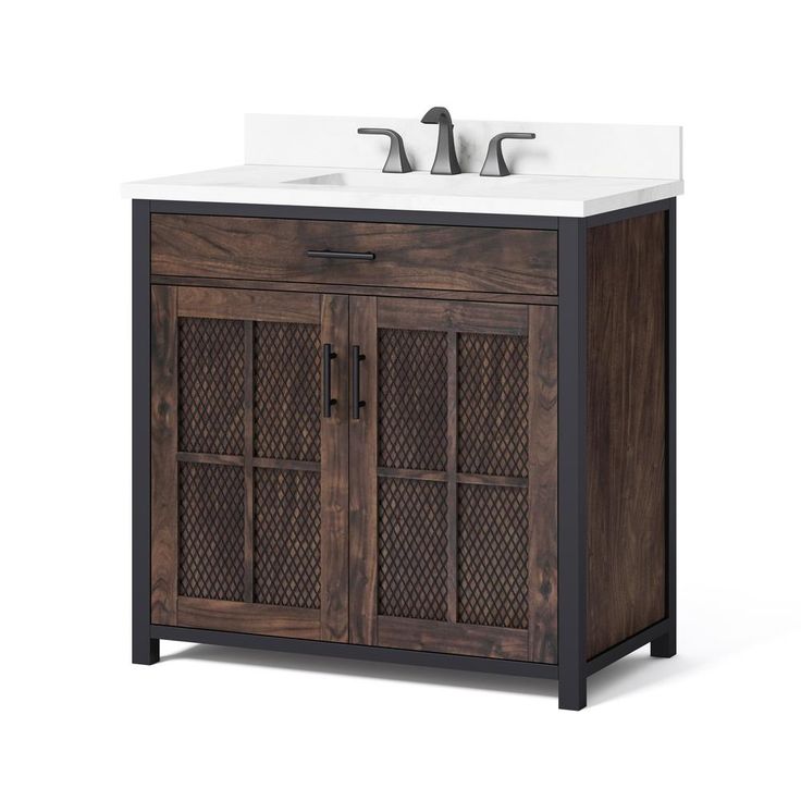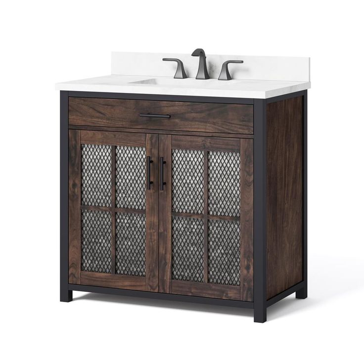 Upgrade your bathroom and give it an industrial look. This Collection Name 36 in. vanity has a rustic antique brown finish, black steel corner accents and metallic steel mesh door fronts over antiqued mirror glass. The 36 in. x 20 in. subtly veined, white Carrera top with matching 4 in. backsplash features a rectangular undercounter ceramic sink. The cabinet doors have euro-style hinges for slow and quiet operation. Youll appreciate the storage space in the open cabinet area, theres also a tip-out drawer for storing smaller items.