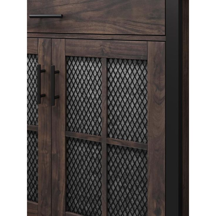 • Antique brown finish, black steel corner accents and steel mesh door fronts
