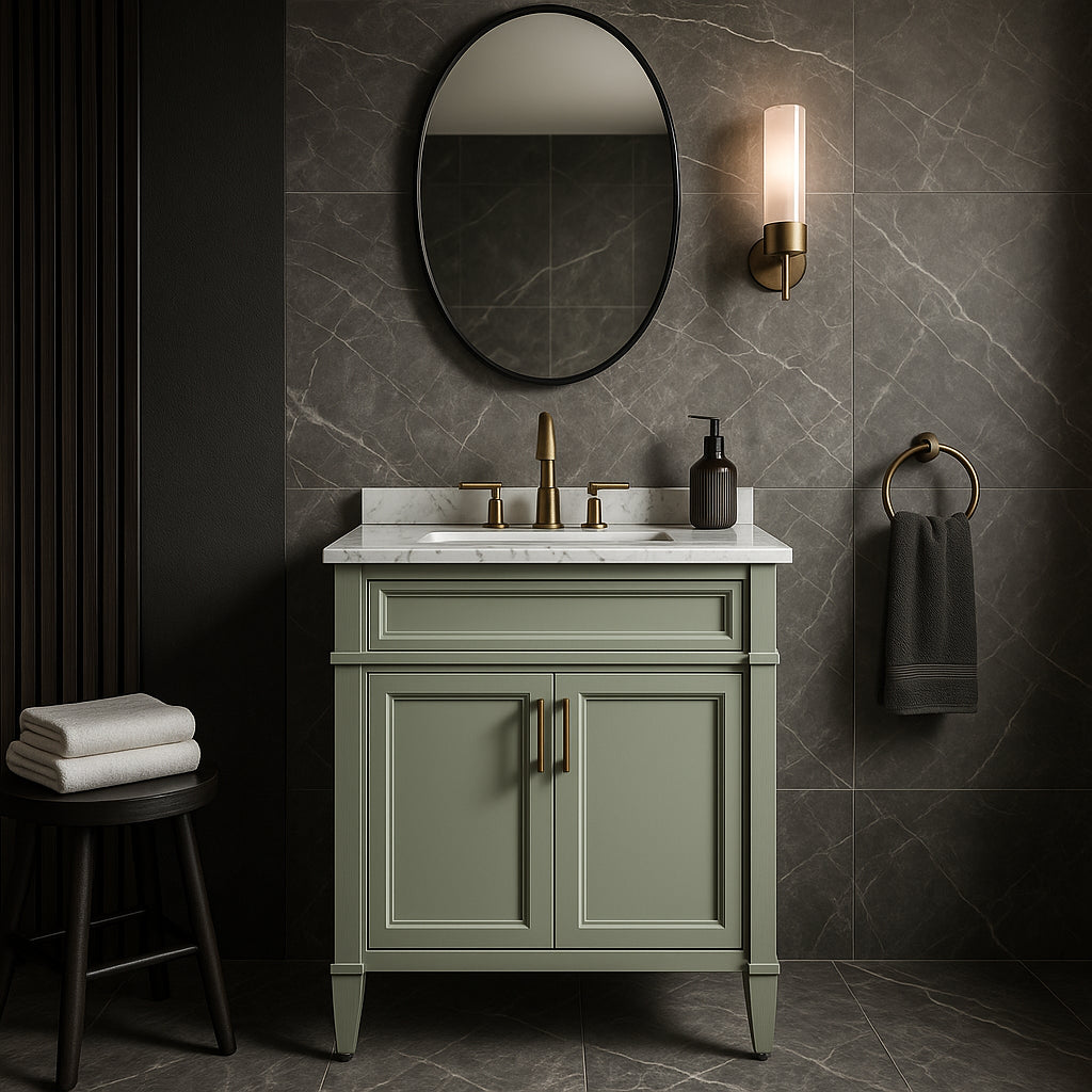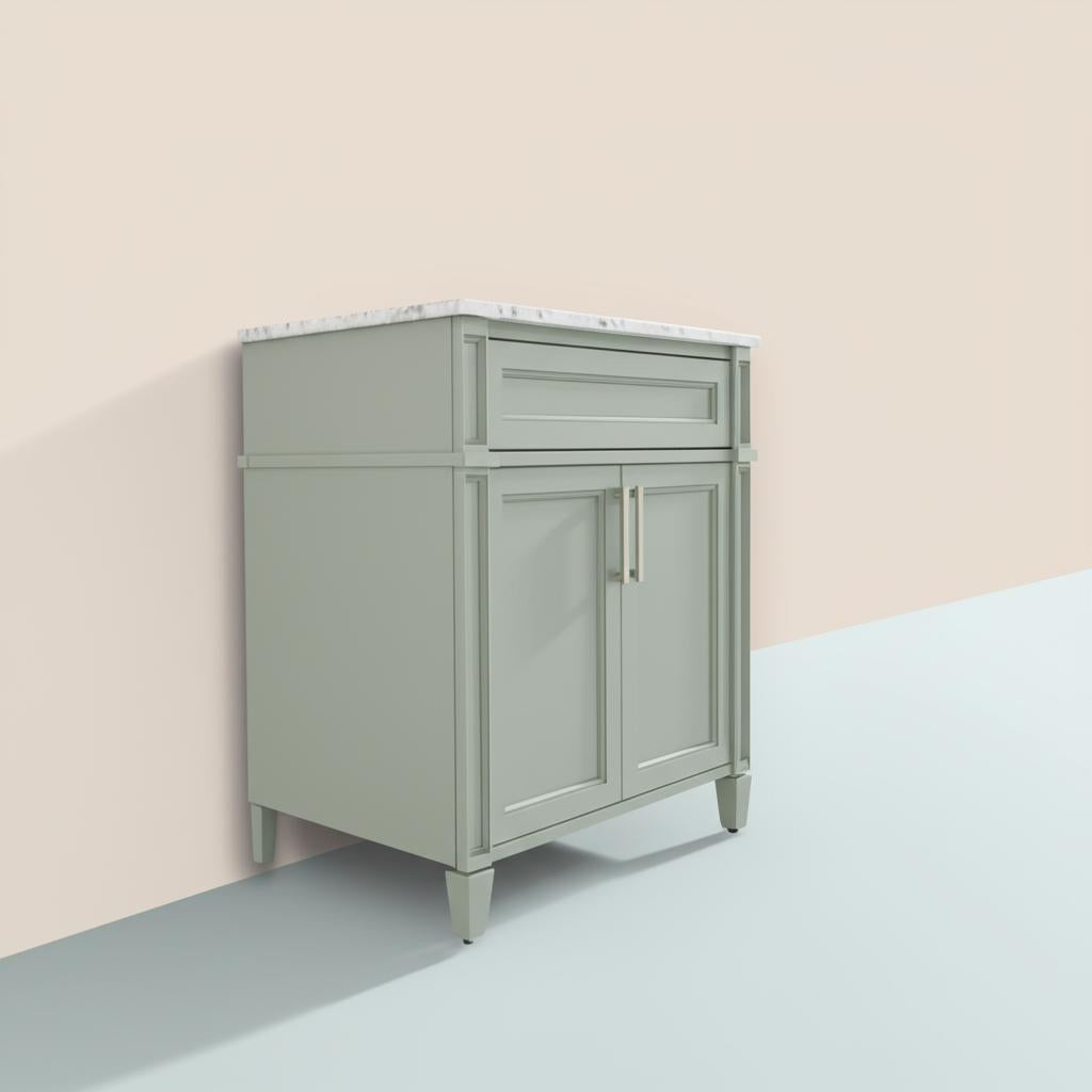 The Caville 30-inch bath vanity combines a sage green finish with a luxurious Carrara marble top, offering a blend of elegance and functionality. Featuring soft-close doors, a tilt-down drawer, and an adjustable shelf, this vanity is perfect for modern bathrooms.