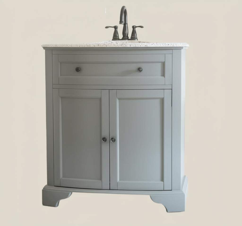 The Hamilton Bath Vanity combines classic cottage charm with modern functionality. Featuring a speckled gray granite top and soft-close doors, this freestanding vanity is crafted from solid birch and MDF for durability and style.