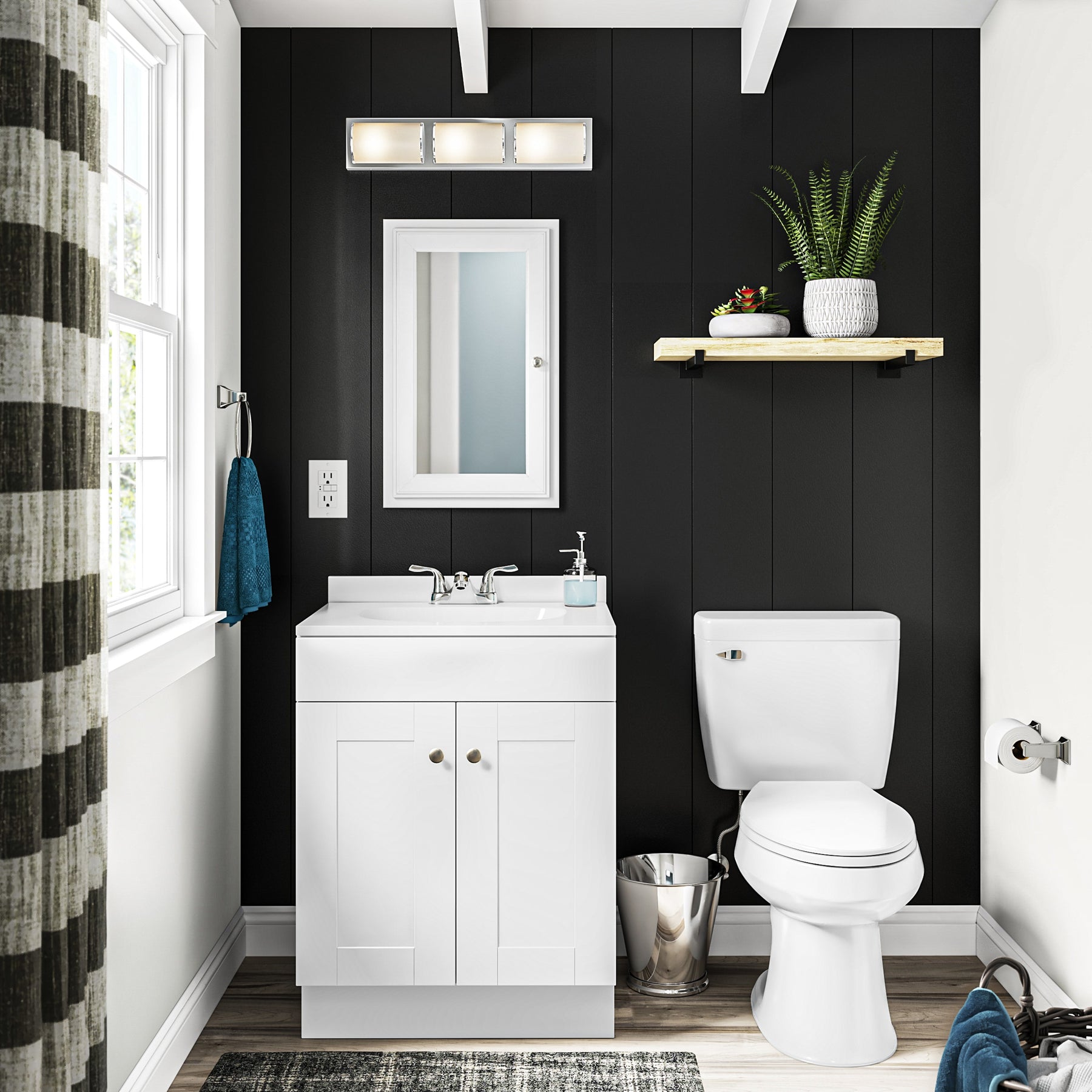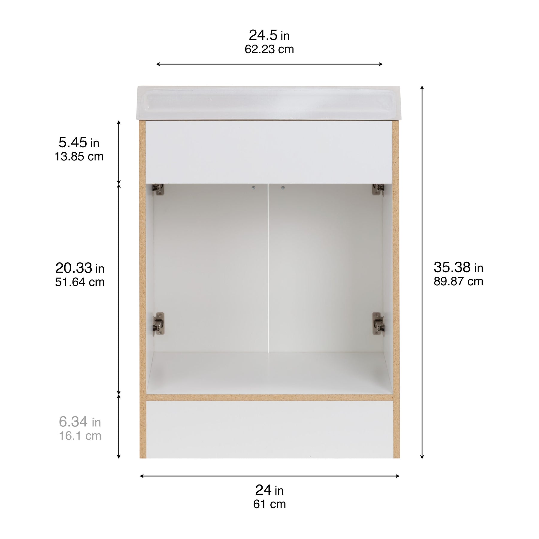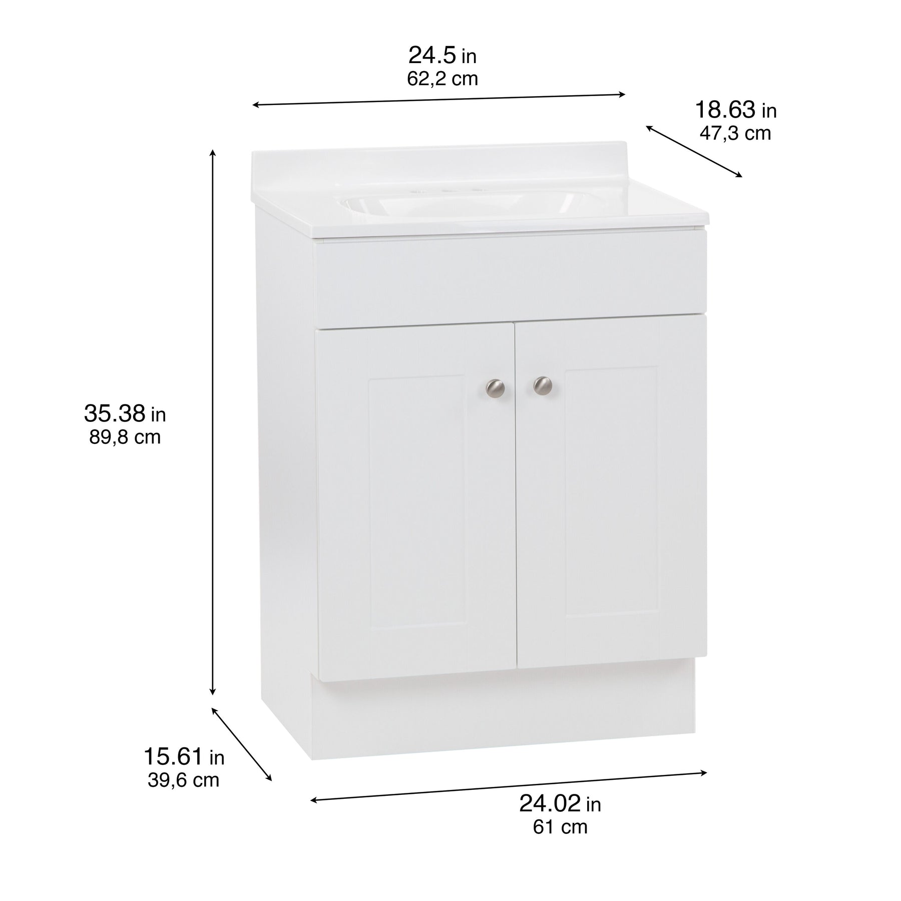 A practical, fully assembled vanity from the Dover collection, built for everyday use. The 24.5-in W freestanding cabinet in True White includes a white cultured marble top with integrated sink and backsplash, offering easy cleaning and dependable style for small baths.