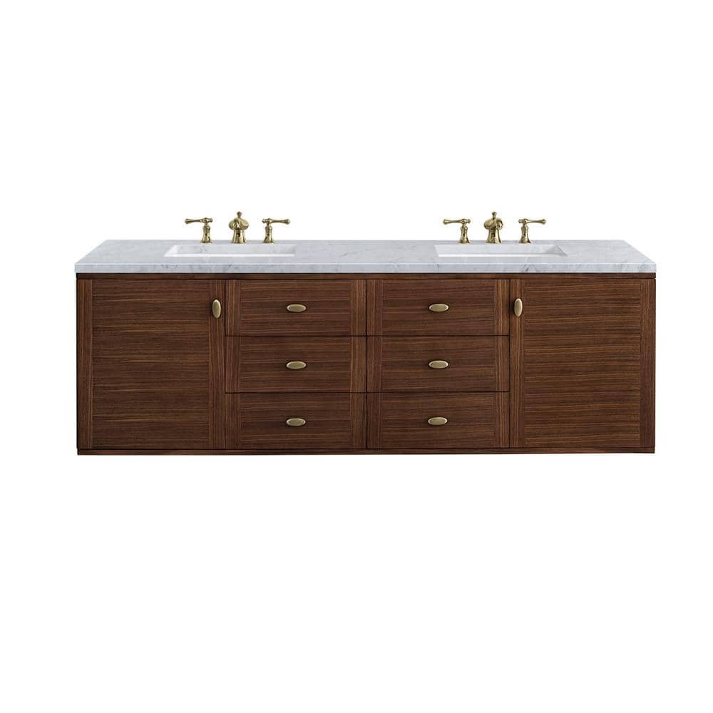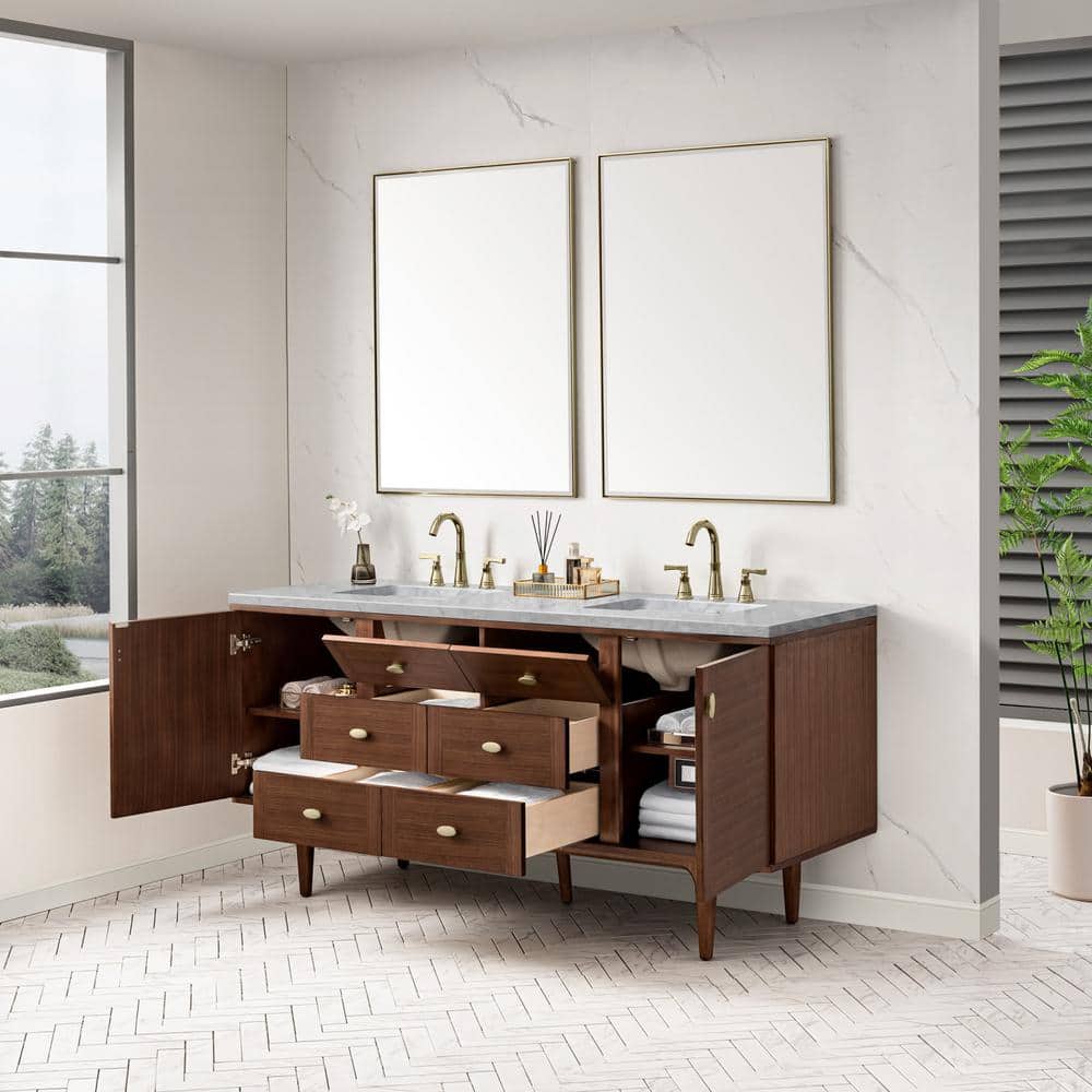 James Martin Vanities Amberly 72" Mid-Century Walnut Bathroom Vanity with Carrara Marble Top
